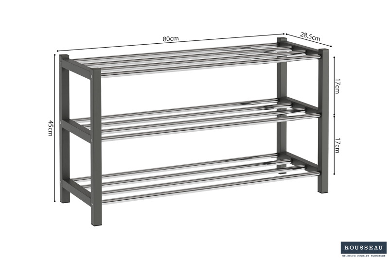 | Bullet Point 3 | Het schoenenrek 'Sam' Grijs biedt handige opslag voor moderne woonruimtes met afmetingen van 45 x 80 x 28.5 cm. |