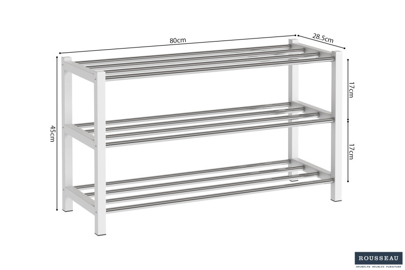 | Bullet Point 2 | Het schoenenrek 'Sam' Wit is een elegante en functionele keuze voor moderne woonruimtes, gemaakt van duurzame materialen zoals metaal verchroomd en gespoten, met afmetingen van H-H 45 x B-L 80 x D-P 28.5 cm, geschikt voor de moderne levensstijl en een perfecte aanvulling op elk interieur. |