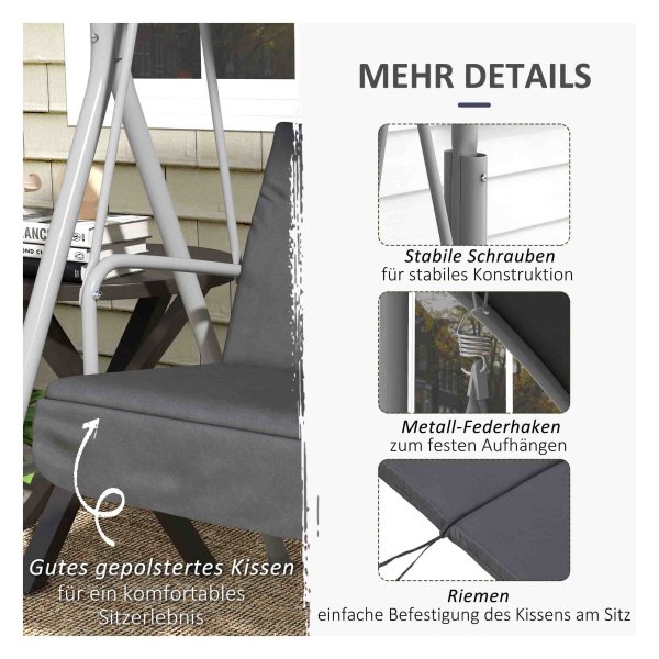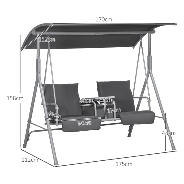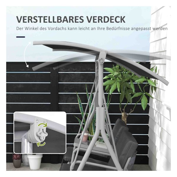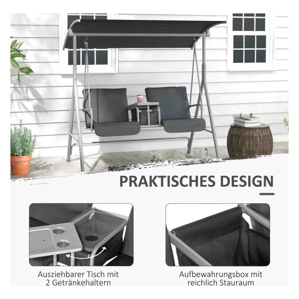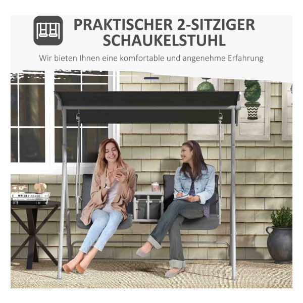 Die schommelbank van Outsunny is ideaal voor de tuin met stevig frame, tafel, verstelbaar dak en comfortabele zitkussens. Geschikt voor 2 personen, perfect voor ontspanning buiten. Gemaakt van metaal en polyester, vereist montage.