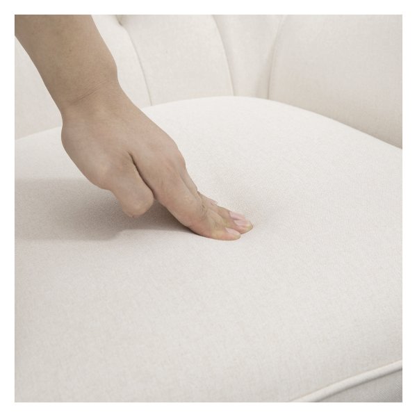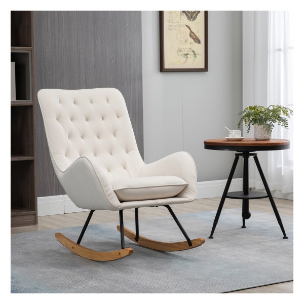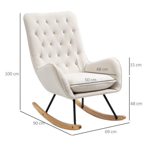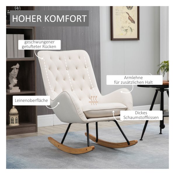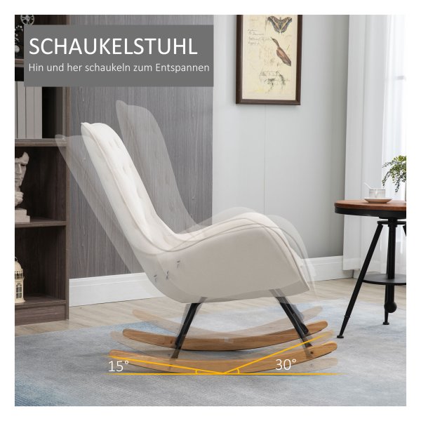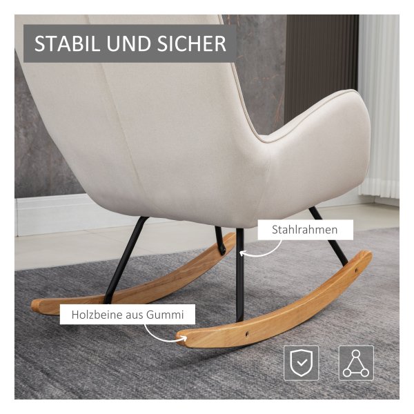 Deze schommelstoel is perfect voor een ontspannen moment voor jezelf of om gezellig samen te zitten. De crèmewitte kleur en houten poten geven de stoel een stijlvolle uitstraling die past bij verschillende interieurstijlen.