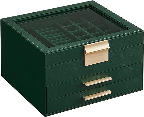 Sieradendoos, 3 -laags sieradendoos, sieradendoos met glazen deksel, 2 laden, sieradenopslag, veel opbergruimte, modern, cadeau voor uw geliefden, Forest Green Gold