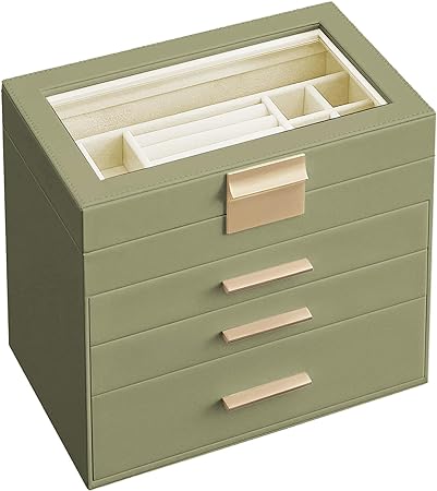 Sieradendoos met 3 laden en glazen deksel voor zonnebrillen en grote sieraden in lauriergroen-goud