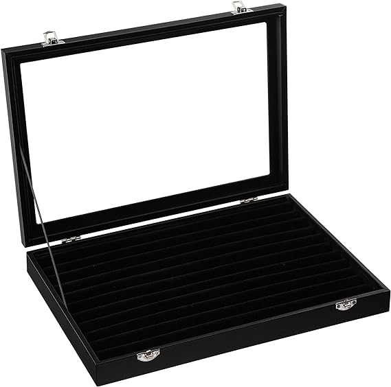 Sieradendoos met glazen deksel, voor ringen, oorbellen, manchetknopen, ringopslagkist voor maximaal 100 ringen vitrine Black