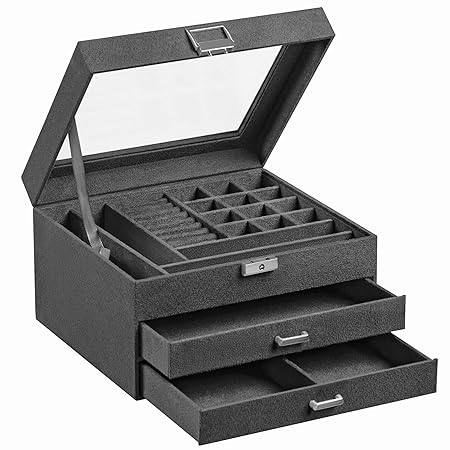 Sieradendoos, Juwelendoos, juwelendoos met 3 niveaus, juwelendoos, fluweel, met glazen deksel, verschillende compartimenten voor halskettingen, armbanden, ringen, met slot en sleutel, grijs