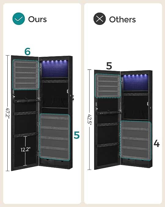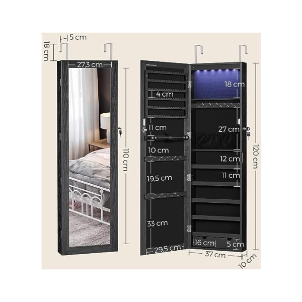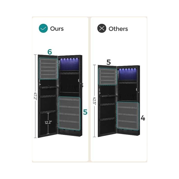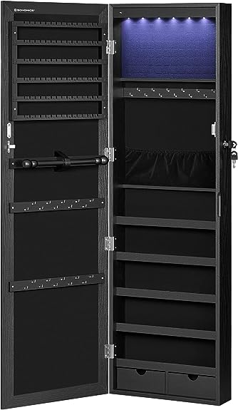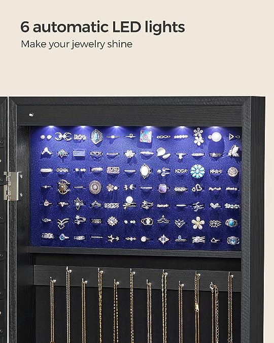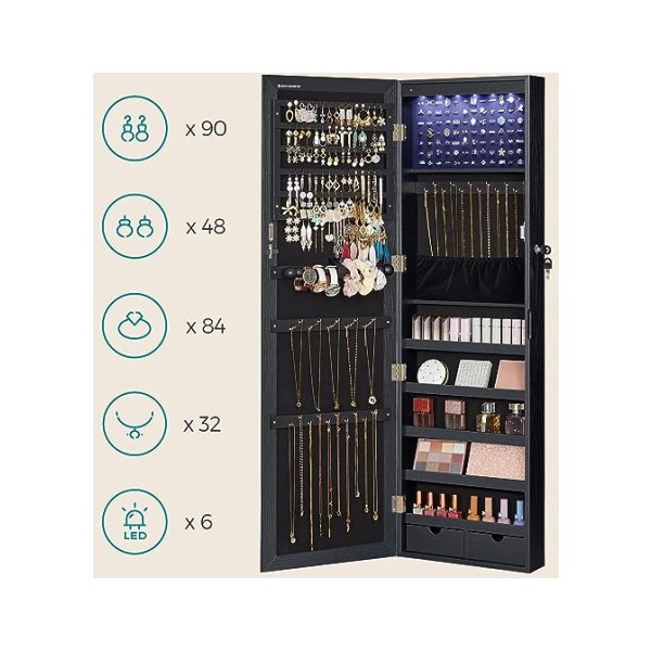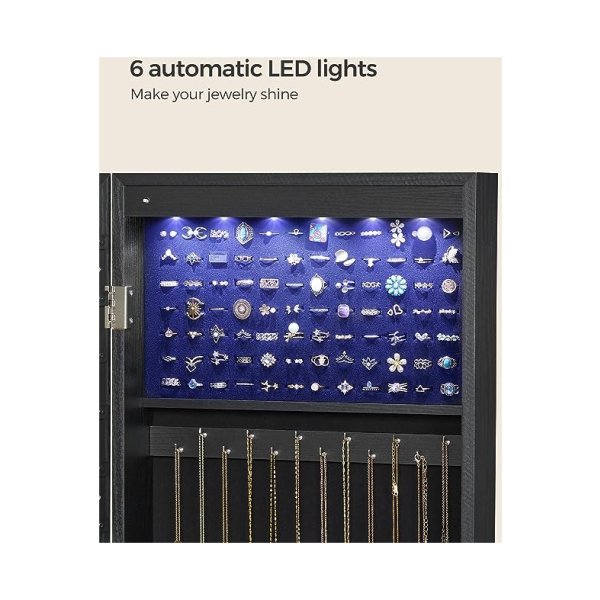 Sieradenkast hangend, wandspiegel, 6 LED-gloeilampen, afsluitbare spiegelkast, wandmontage, hangend aan de deur, zwart