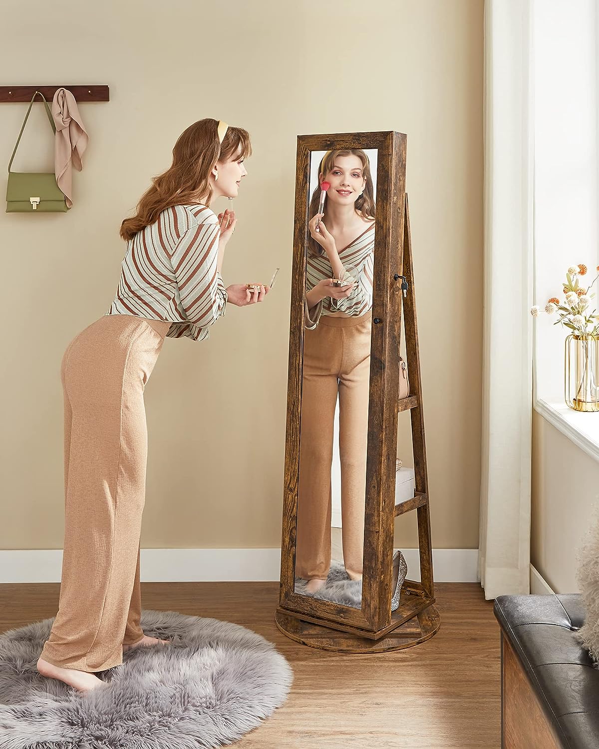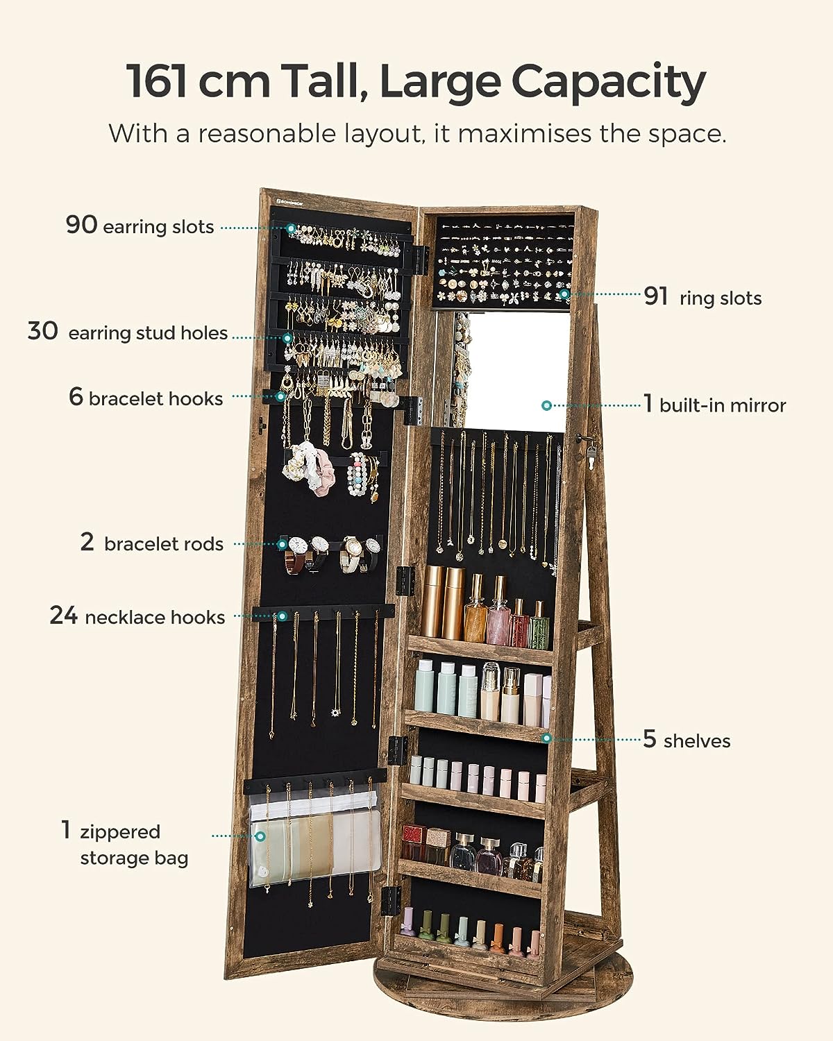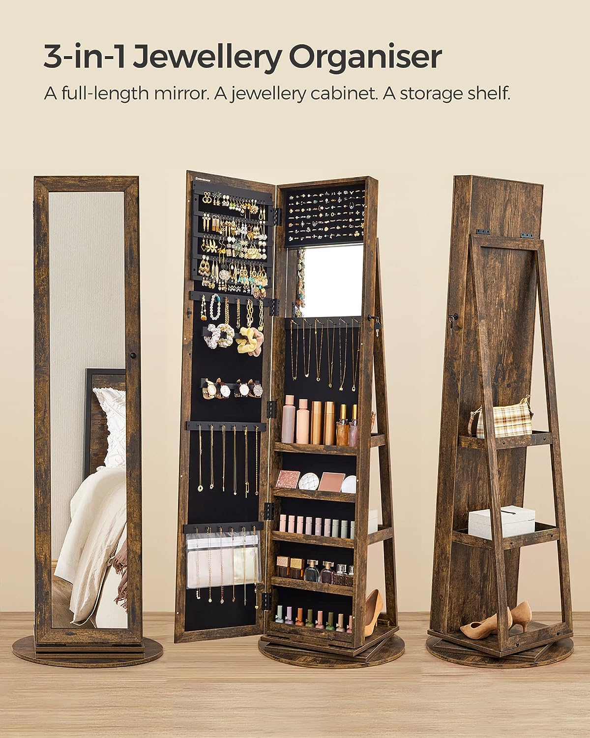 Sieradenkast, Spiegelkast, 360° Draaibaar, Afsluitbaar, 3-İn-1, Sieraden Opberger, Met Spiegel, Planken, Slot, Vintage Bruin