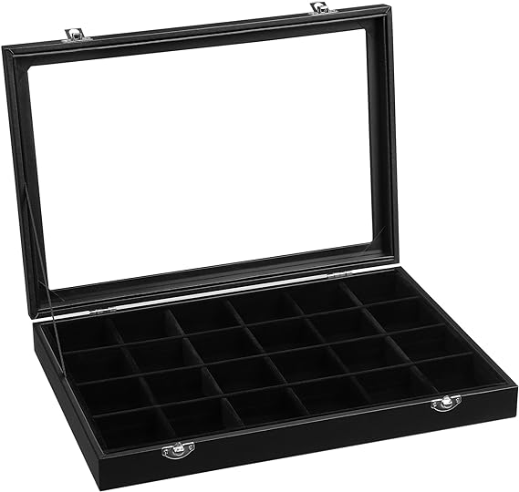 Sieradenlade, 24 compartiment juwelenbox, sieradenorganisator met fluweelhoes, glazen deksel en sluiting, cadeau -idee, 35 x 24 x 4,2 cm, zwarte