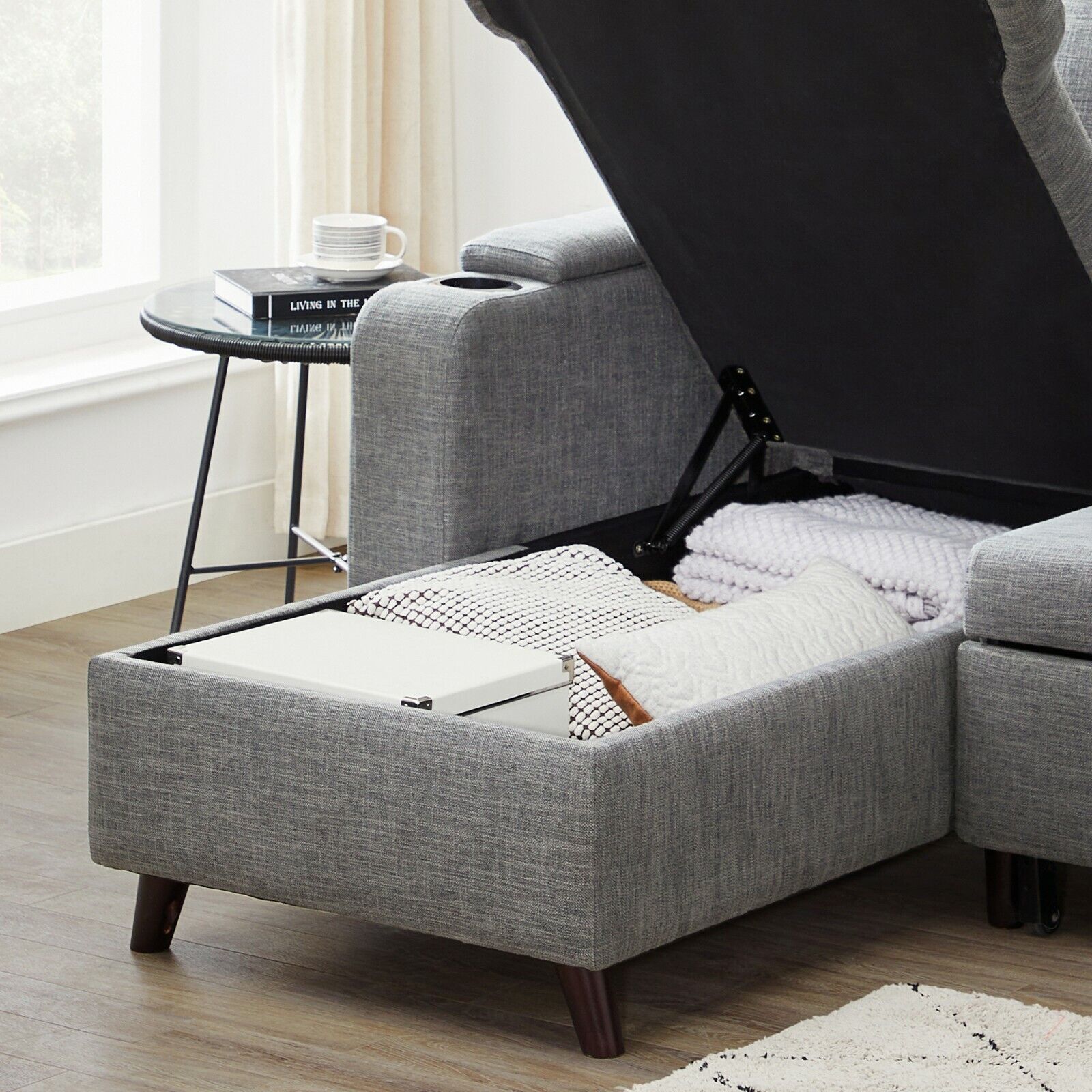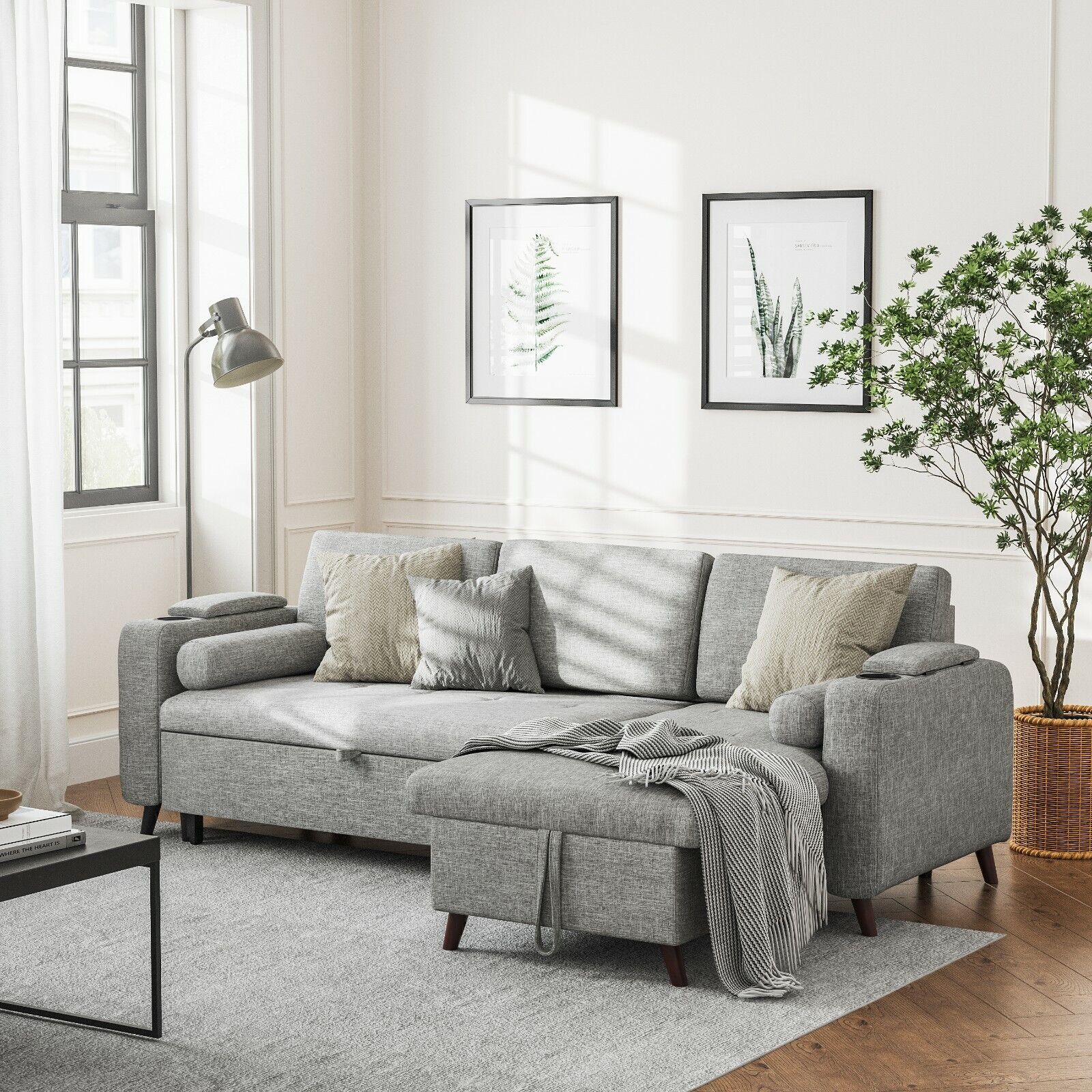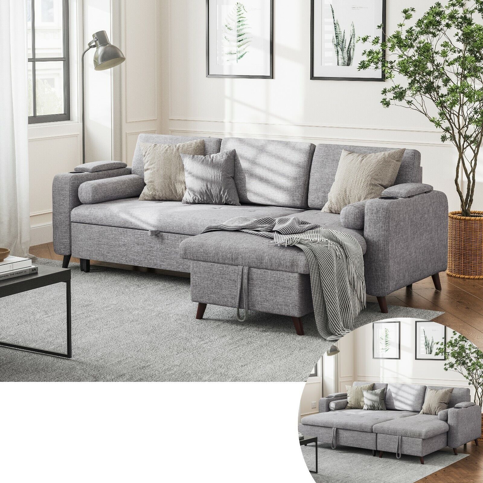 Slaapbank, Bedbank met opbergruimte, gestoffeerde meubels, lichtgrijs