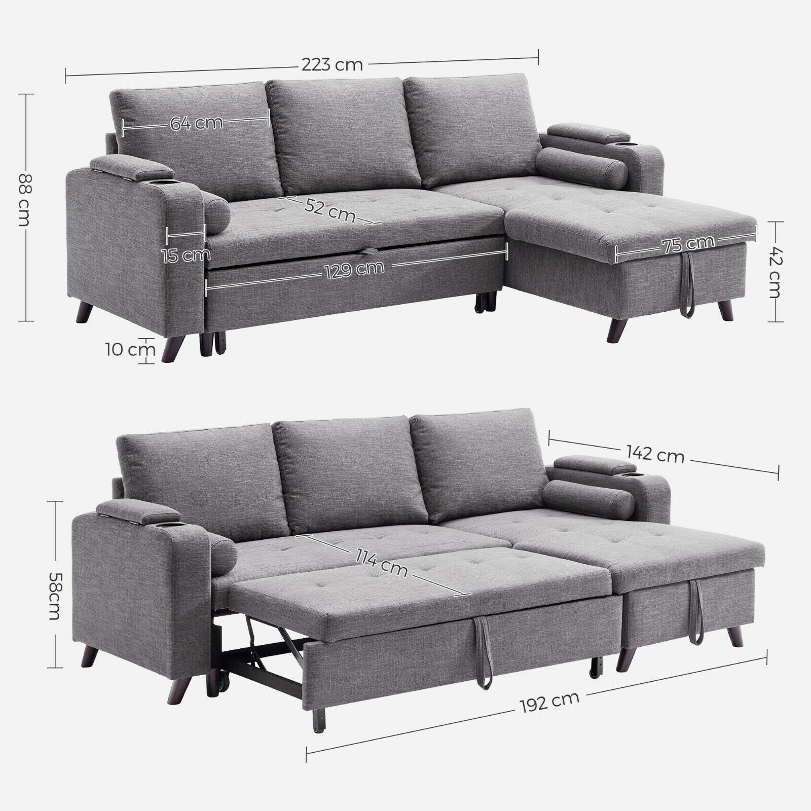Totale afmetingen van de bank: 226 x 142 x 88 cm (l x b x h)