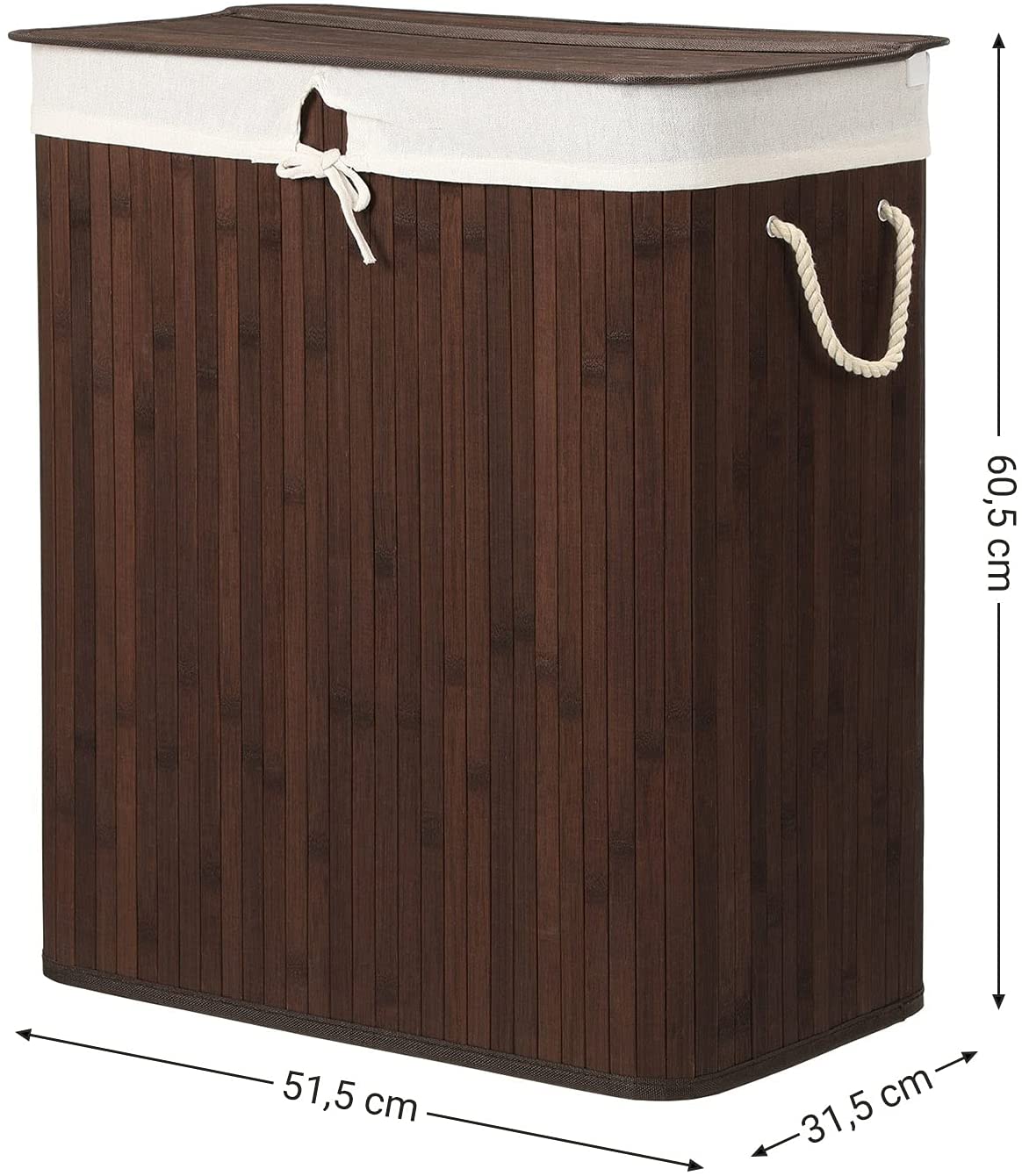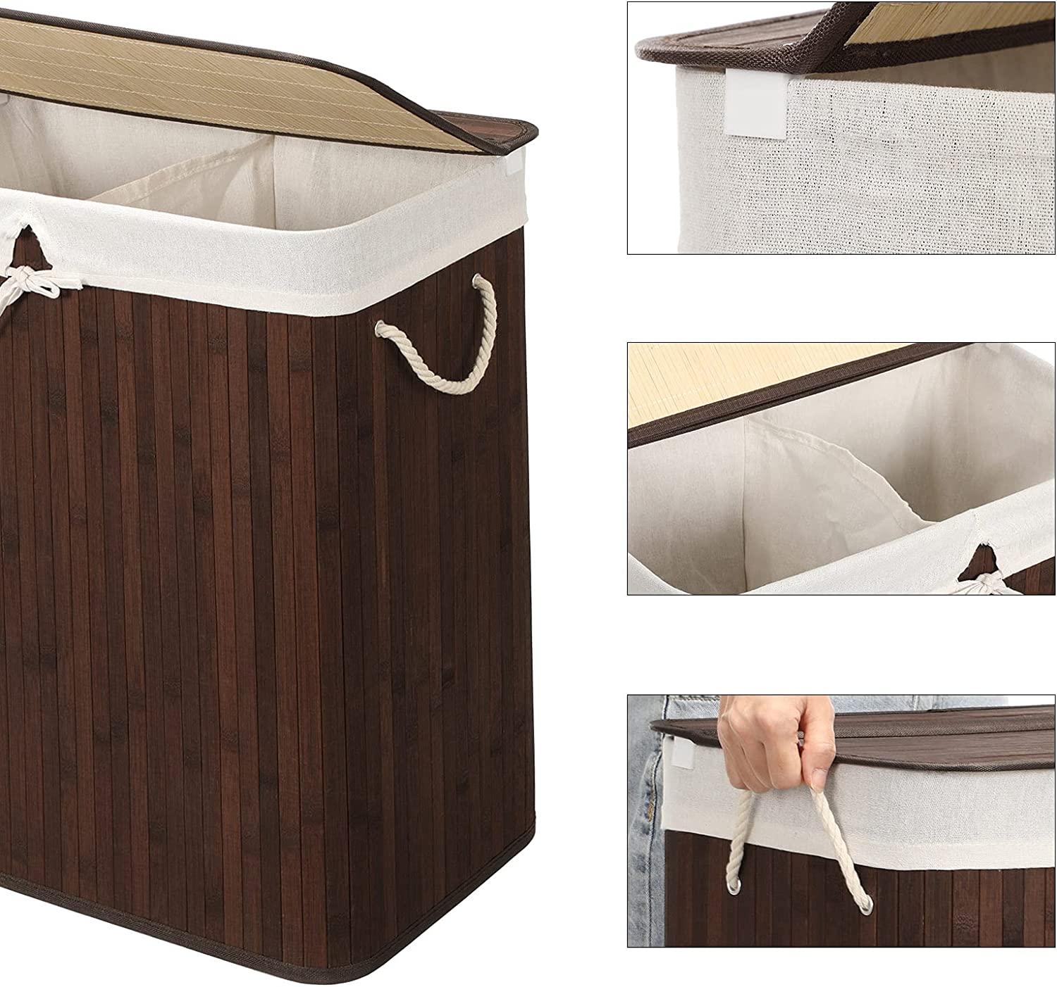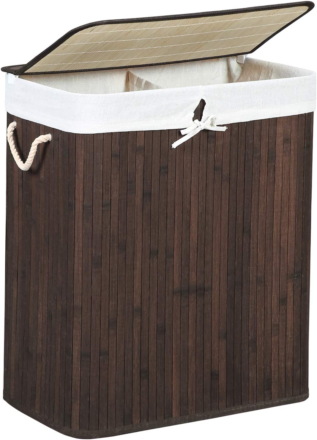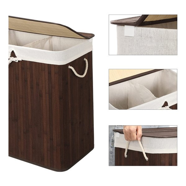 Bamboe Wasmand, 100 L Wasbak, Wasmand Met 2 Compartimenten, Wassorteerder Met Deksel En Verwijderbare Waszak, Katoenen Handgrepen, Bruin