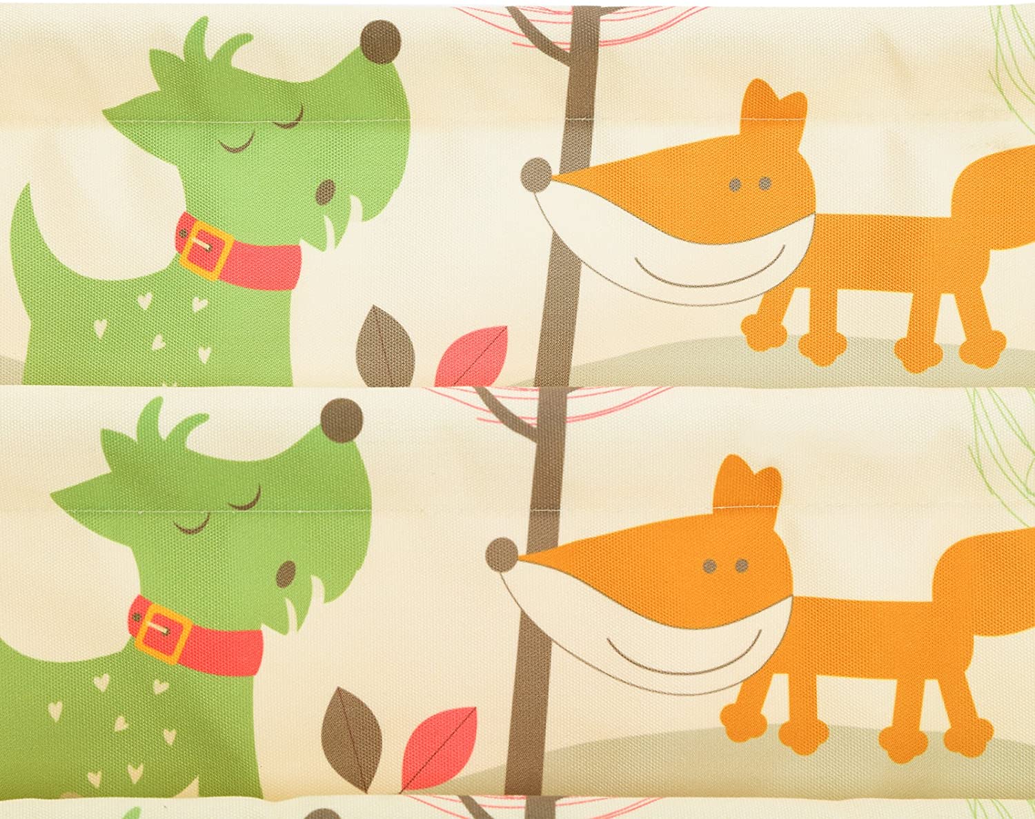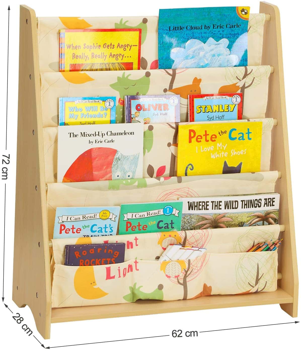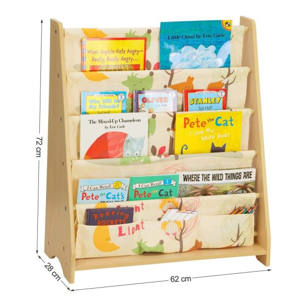 Decoratief: Het mooie boekenkast met zijn heldere kleuren trekt de kinderen aan. Dieren, bomen, vogels enz. brengen enthousiasme in het leven en denken van kinderen. 3 kleine zakken op de bodem bieden extra opbergruimte voor schoolspullen