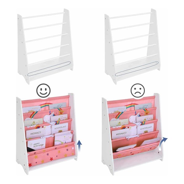Wat je krijgt: een kinderboekenkast van 5 verdiepingen met montageaccessoires en gedetailleerde instructies. Bevorder de opslag- en organisatorische vaardigheden van uw kinderen en breng samen weer orde in de kinderkamer