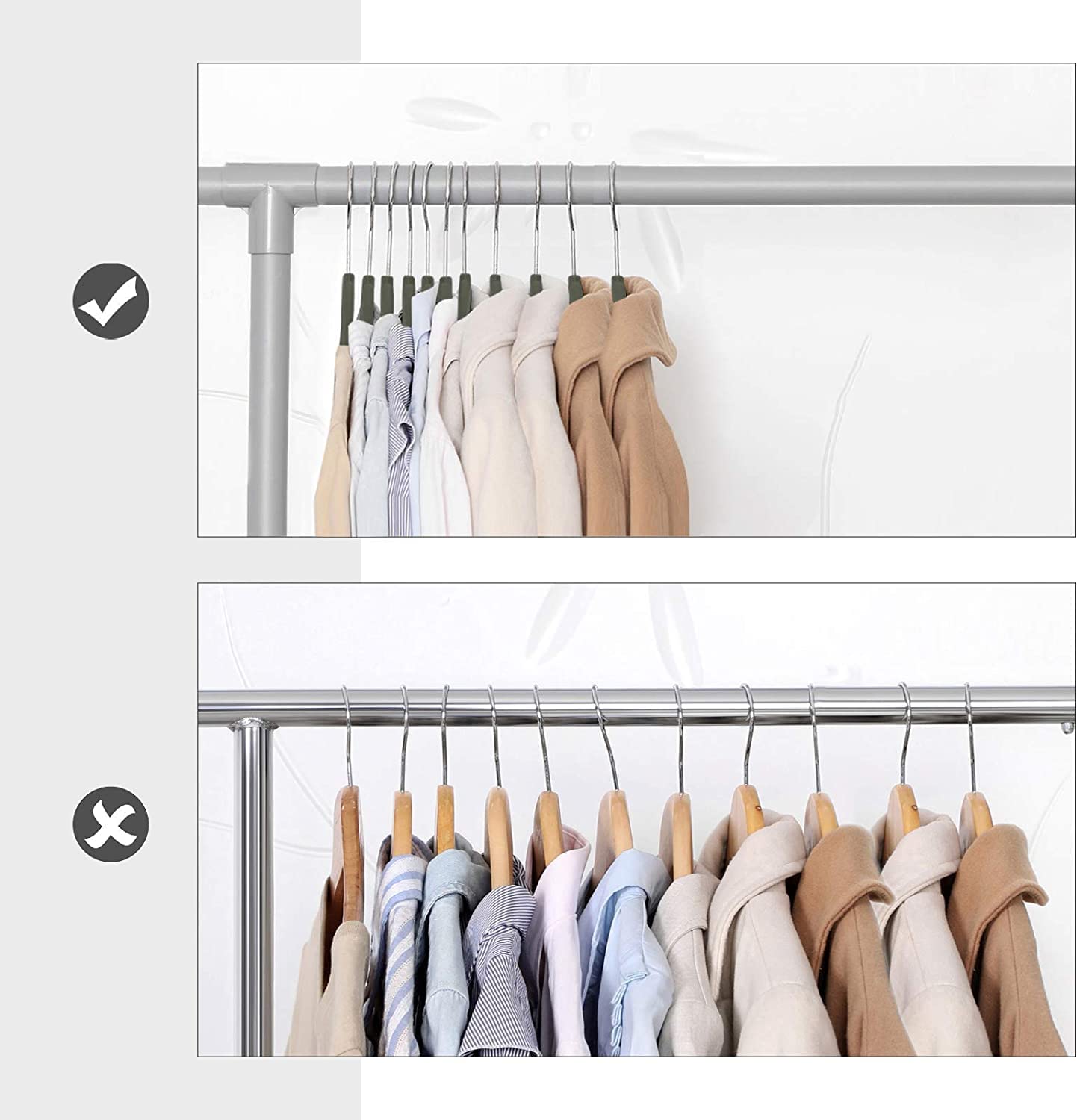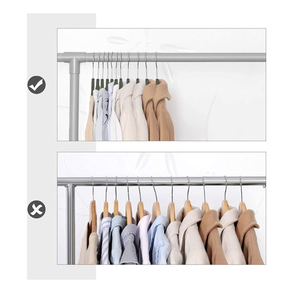 Bullet Point 4 | Chromed hangende haken: chic, glanzend en duurzaam.De haken kunnen ook 360 ° worden gedraaid, de hangers zijn praktisch en passen zich aan aan de inhoud van uw garderobe. |