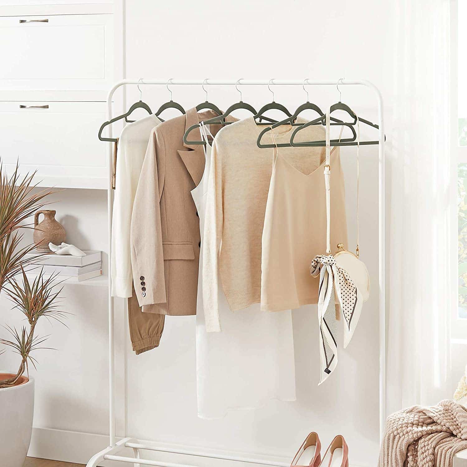 Bullet Point 5 | Multifunctionele kledingrail: dankzij de inkepingen aan de zijkanten van de beugel, kunt u bijvoorbeeld gemakkelijk tanktops of rokken met lussen hangen.Bovendien hebben de beugels houders voor broeken en stropdassen, doeken, sjaals of riemen |