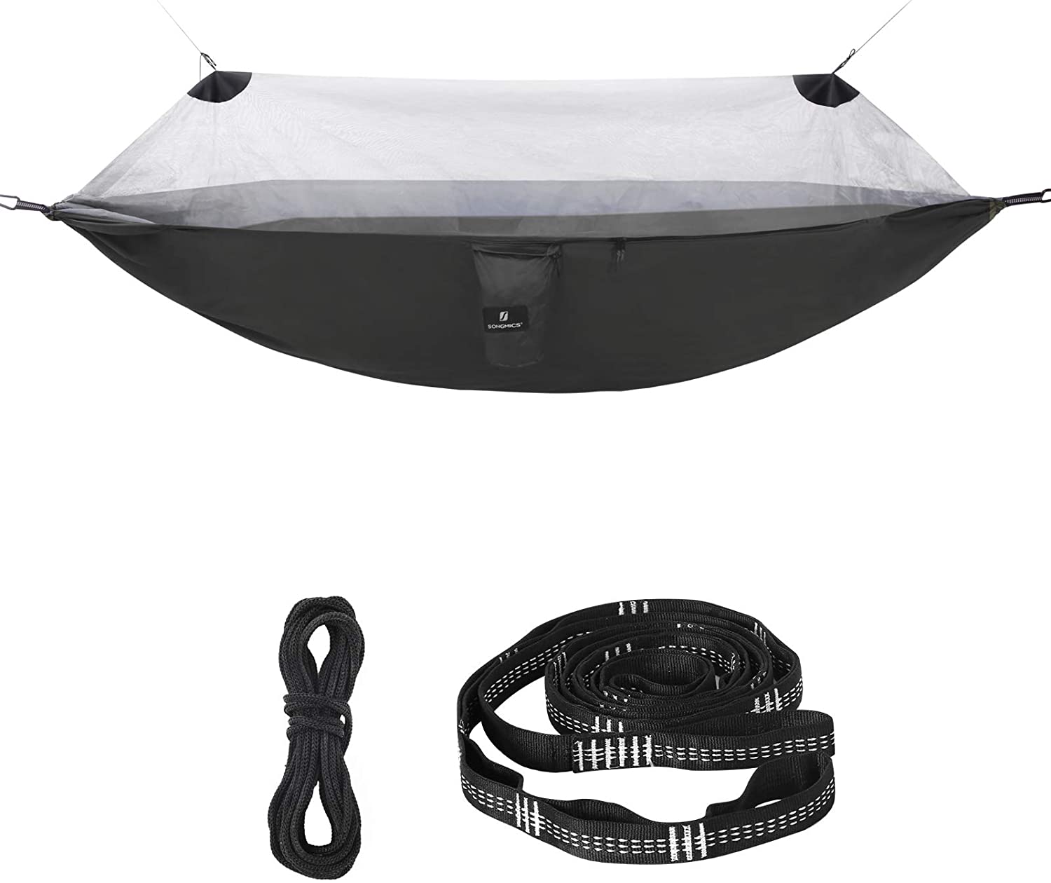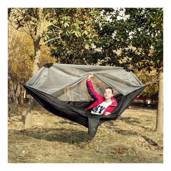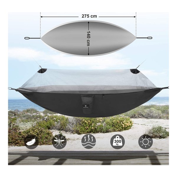 Frisse lucht, blauwe hemel, fonkelende sterren: Bevestig deze hangmat eenvoudig aan twee bomen, leg je erin en geniet ‘s nachts van de frisse lucht, de blauwe hemel of fonkelende sterren terwijl de hangmat zacht schommelt. Deze duurzame hangmat met muggennet biedt je rondom bescherming en beschermt je tegen muggen en andere insecten.