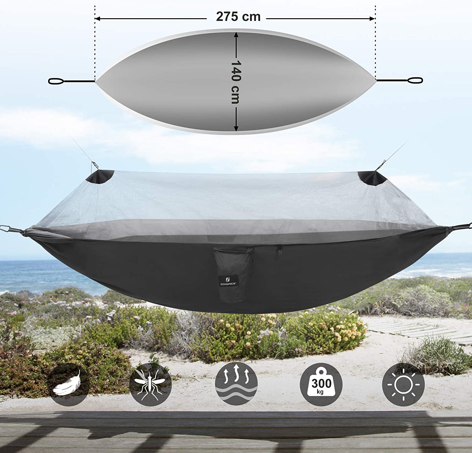 Hangmat Met Muskietennet, Ultralicht, Voor 2 Personen, Ripstop Nylon, Sneldrogen, Riemen Met Meerdere Lussen, Belastbaar Tot 300 Kg, 275 X 140 Cm, Kamperen