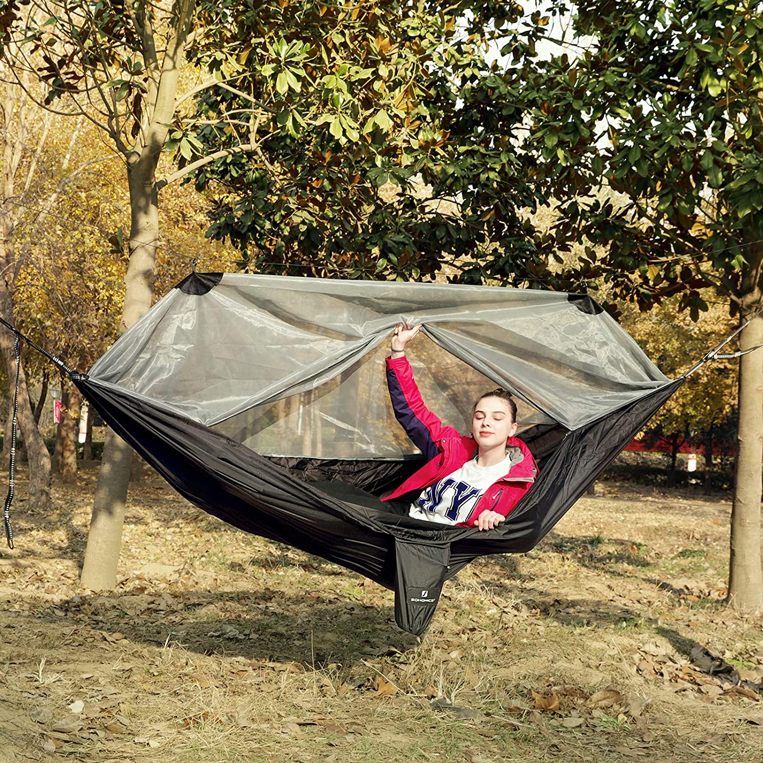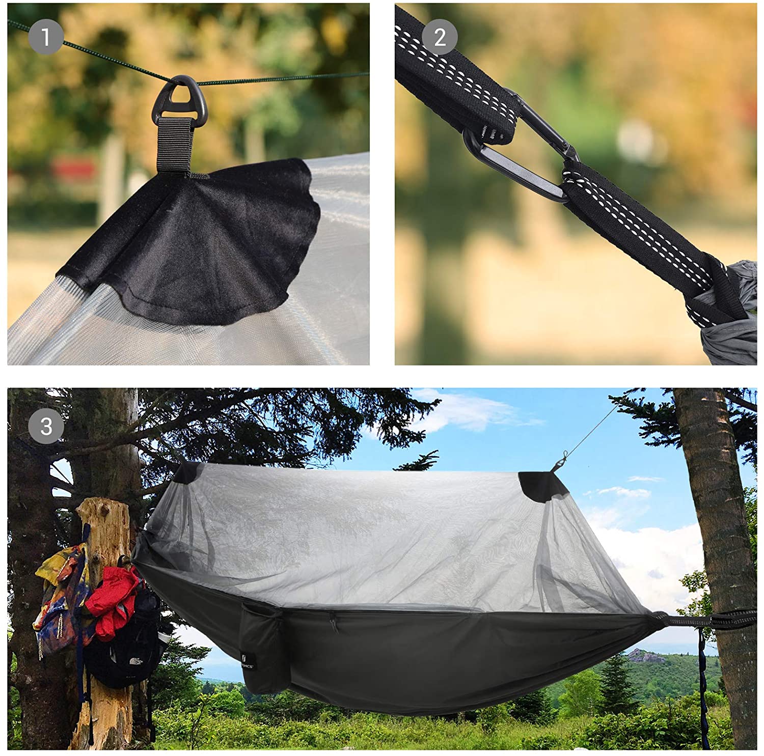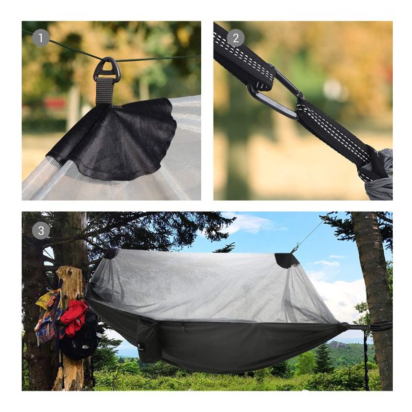 *Wat je krijgt: een hangmat met muggennet, die is voorzien van een binnenzak voor je mobiele telefoon en een ritssluiting met dubbelzijdige ritssluiting, 2 lange riemen met meerdere lussen, 2 sterke karabijnhaken, betrouwbare klantenservice en een 100% tevredenheidsgarantie
