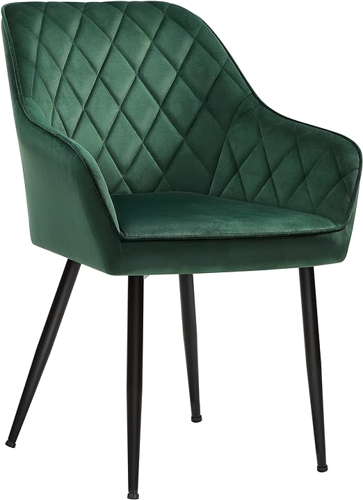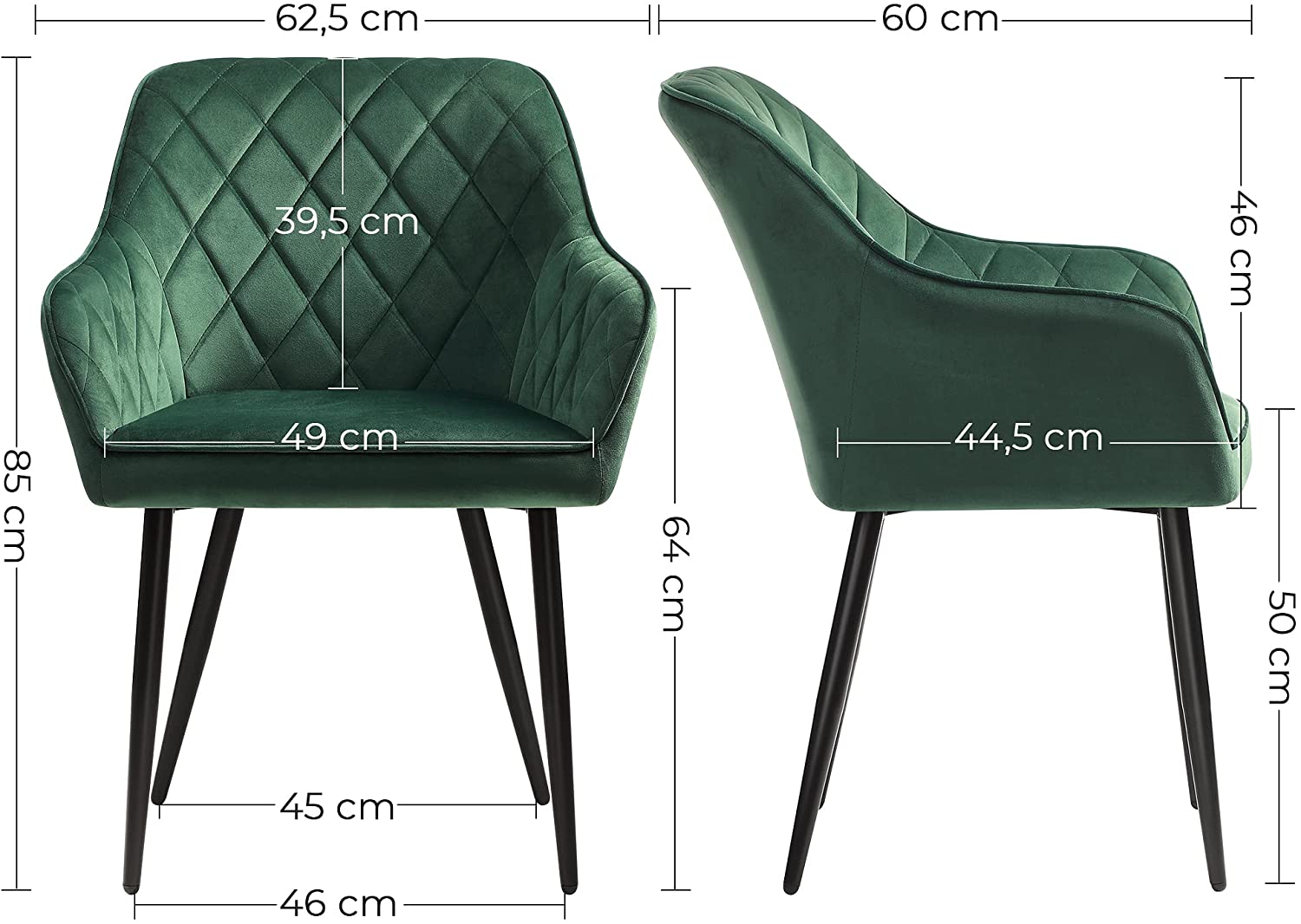 Kleur: groenMateriaal: gepoedercoate metalen poten, houten plaat, fluweel, schuimstofvulling. Totale afmetingen: 62,5 x 60 x 85 cm (l x b x h). Zithoogte: 50 cm. Zitbreedte: 49 cm. Zitdiepte: 44,5 cm. Hoogte rugleuning: 39,5 cm. Hoogte van de armleuningen (vanaf de vloer): 64 cm. Dikte van het zitkussen: 7 cm. Gewicht: 6,5 kgMax. Statische belastbaarheid: 110 kg