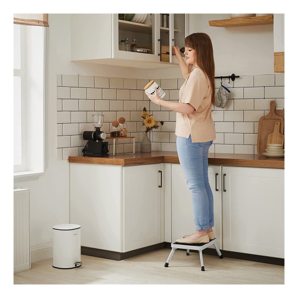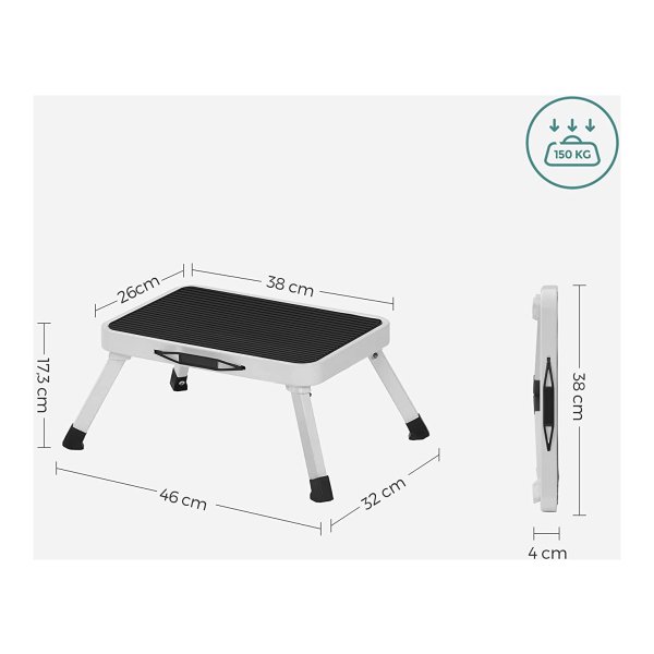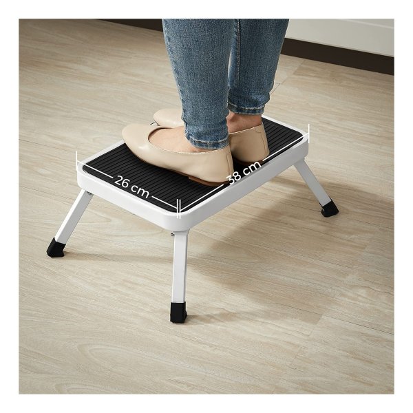 Door vier naar buiten gerichte voeten met antislip rubberen doppen zorgt de trap voor uitstekende stabiliteit en voorkomt het risico op kantelen; de klapbeveiliging wordt door veiligheidsknoppen beveiligd. Het klaptrap met compacte afmetingen en een praktische handgreep is zeer eenvoudig op te bergen en heen en weer te dragen. Extra groot en antislip loopvlak (38 x 26 cm) met geribbelde antislipmatten zorgt voor aangenaam en veilig stijgen.