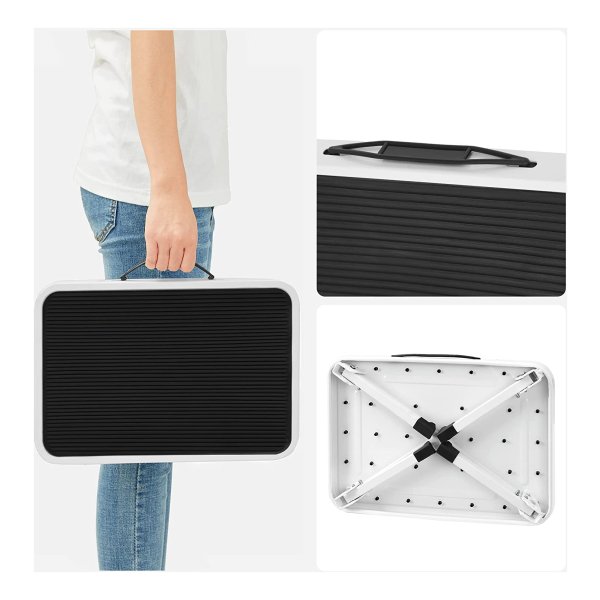 Ruimtebesparend op te bergen en gemakkelijk te dragen: opgevouwen slechts 4 cm smal, kan zelfs in de hoeken, laden of spleten tussen muren en kasten worden geplaatst; met een handgreep is de klapkruk (1,9 kg) zeer praktisch te transporteren