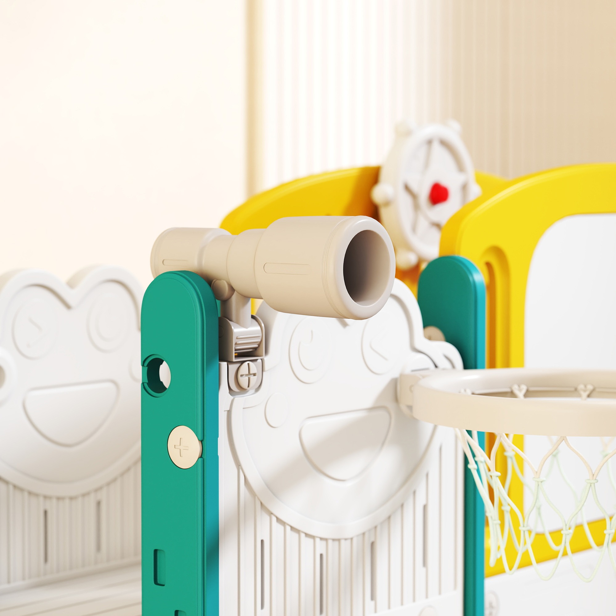 - Inclusief 7-in-1 speelmogelijkheden: glijbaan, basketbalring, telescoop, tekenbord en meer
