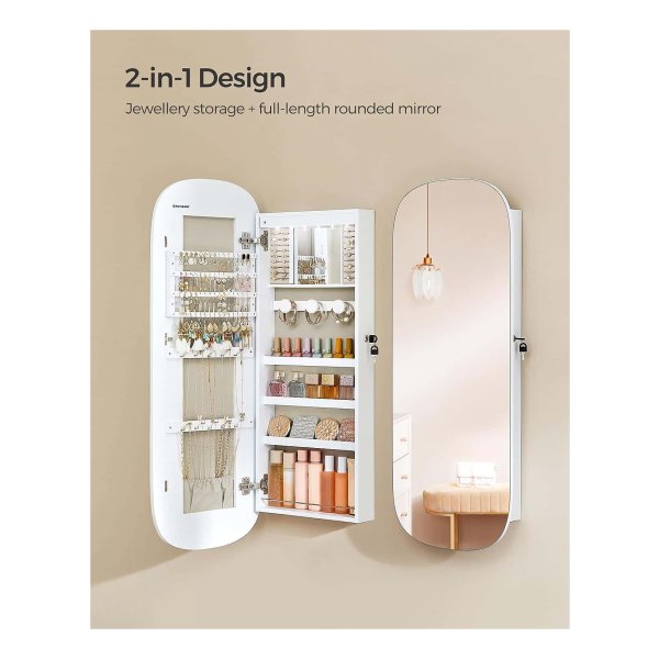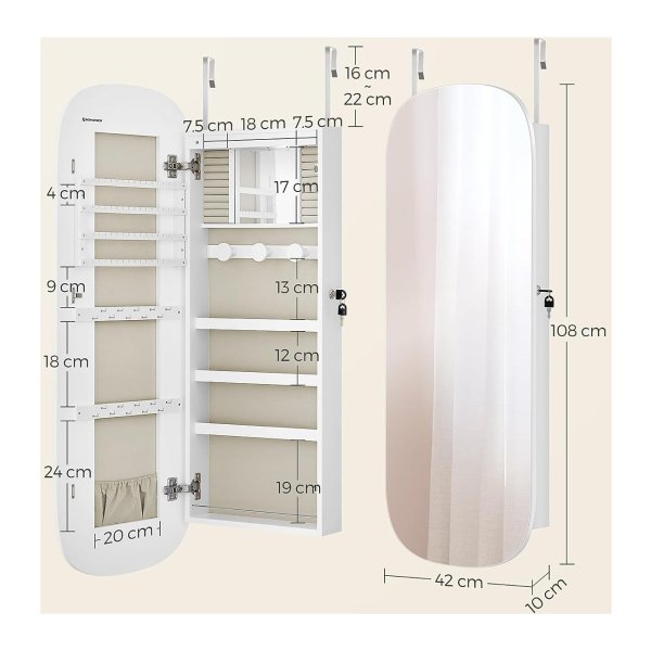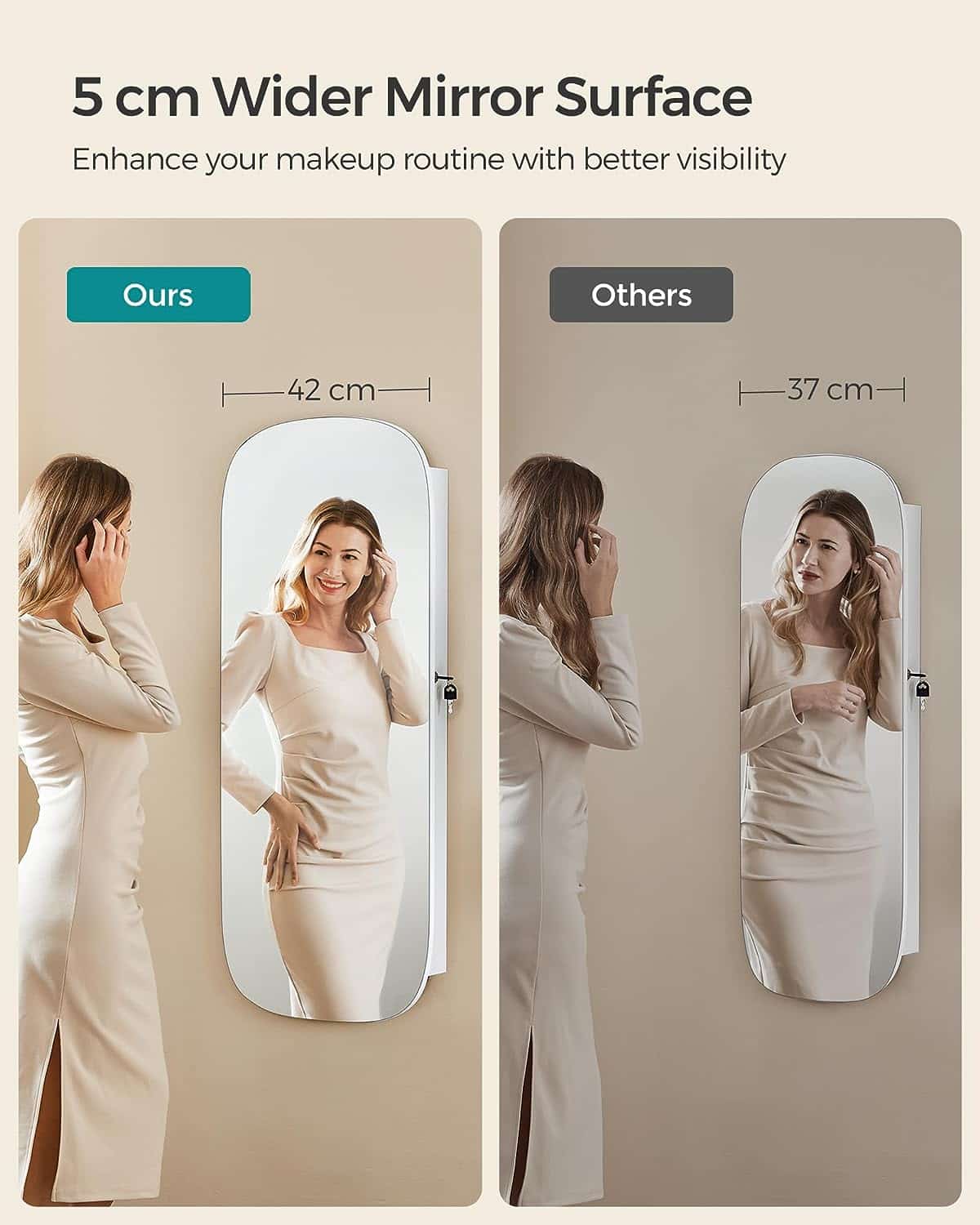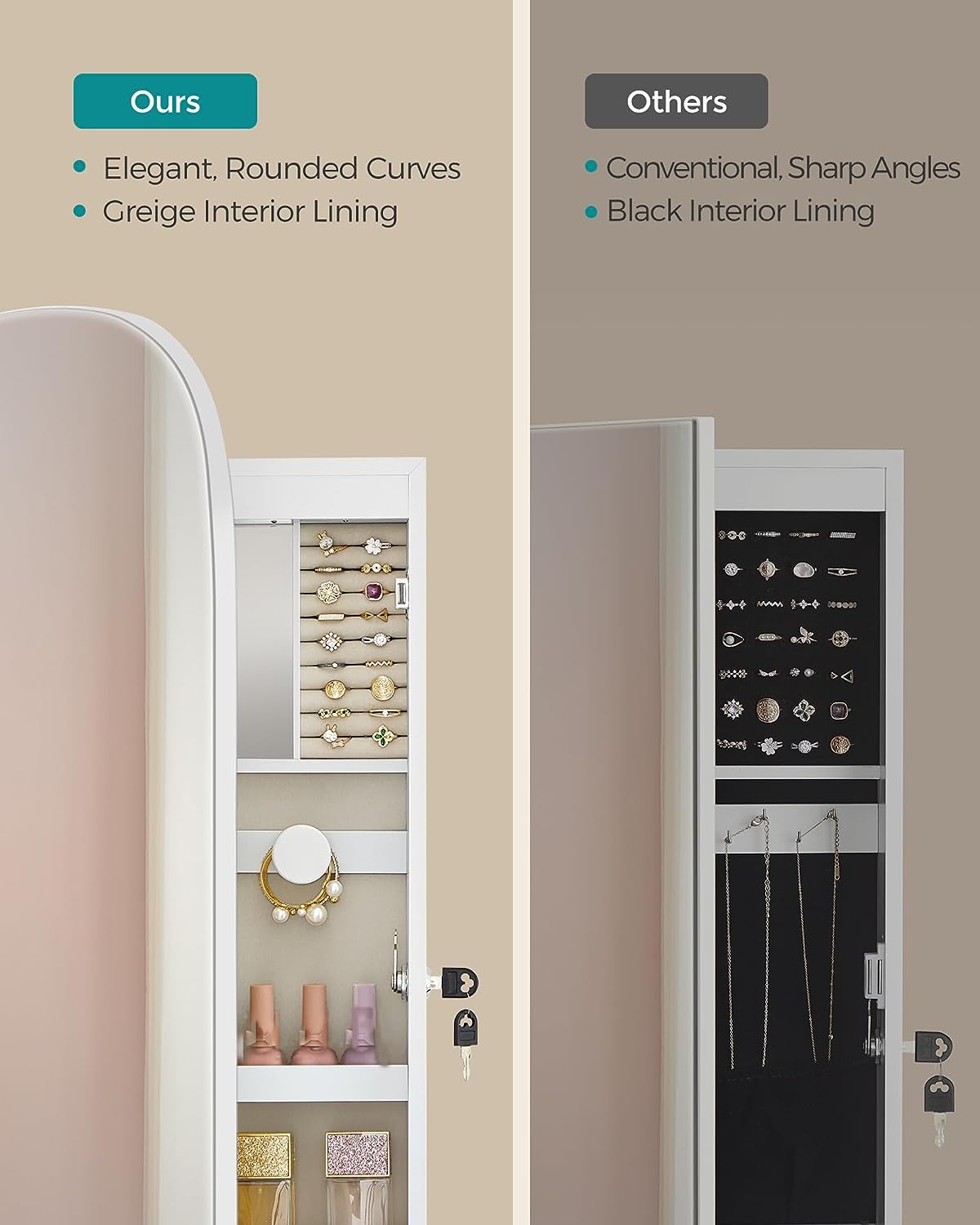 Spiegel Met Opbergruimte, Led-Spiegel Sieradenkast Wand-/Deurmontage, Afsluitbare Ronde Brede Spiegelkast, Met Binnenspiegel, 10 X 42 X 108 Cm, Wit Oppervlak Met Greige Voering