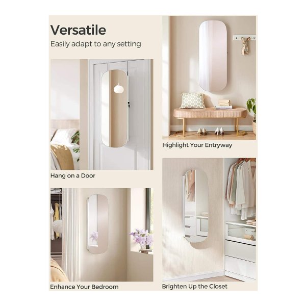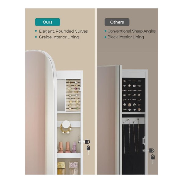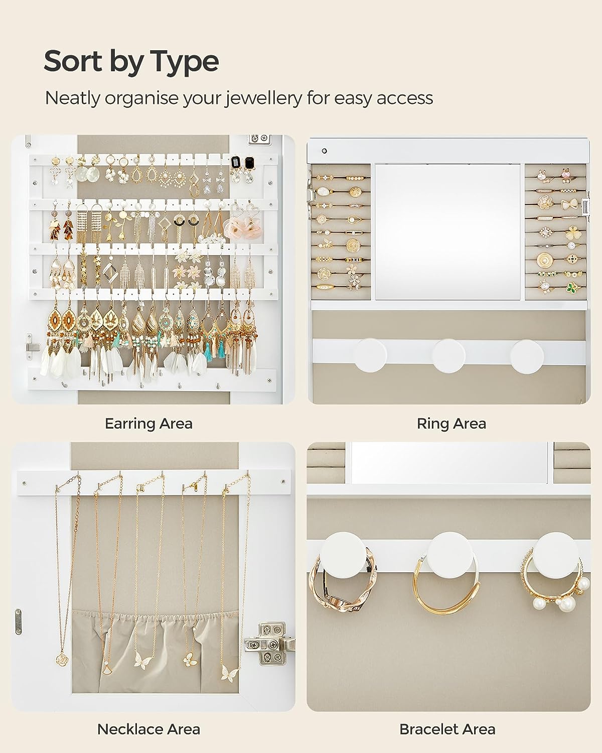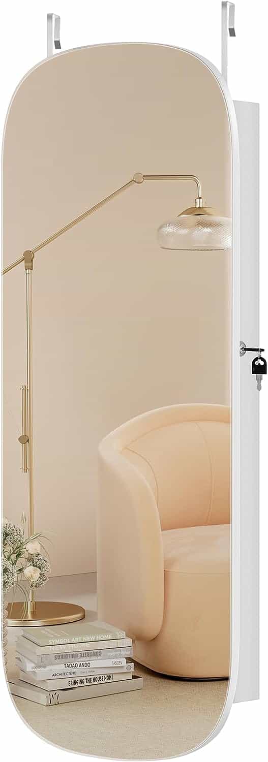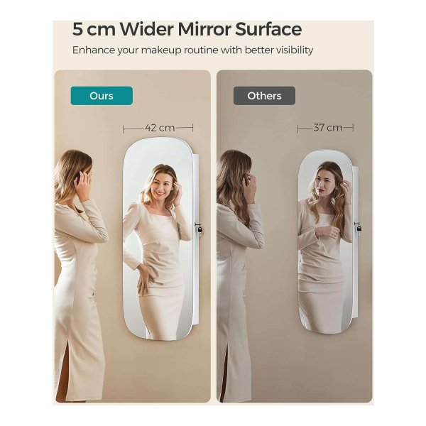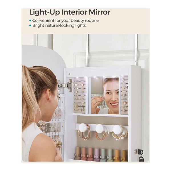 Spiegel Met Opbergruimte, Led-Spiegel Sieradenkast Wand-/Deurmontage, Afsluitbare Ronde Brede Spiegelkast, Met Binnenspiegel, 10 X 42 X 108 Cm, Wit Oppervlak Met Greige Voering