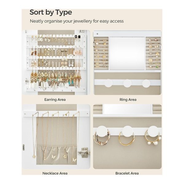Tags: Afsluitbare, JJC026W01, led spiegel sieradenkast, met binnenspiegel, Spiegel met opbergruimte, wand en deurmontage, wit oppervlak met greige voering