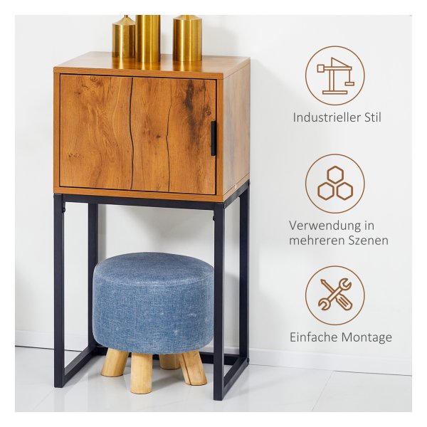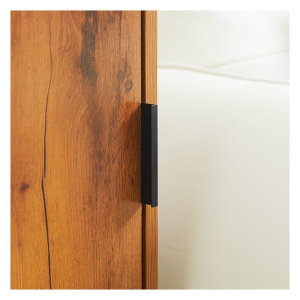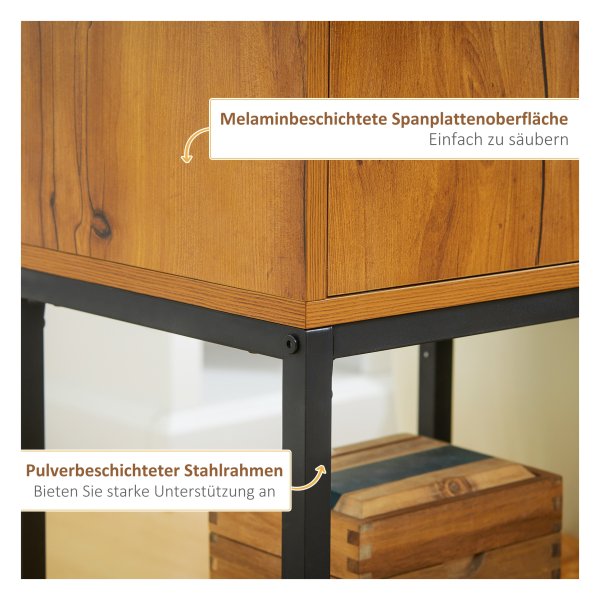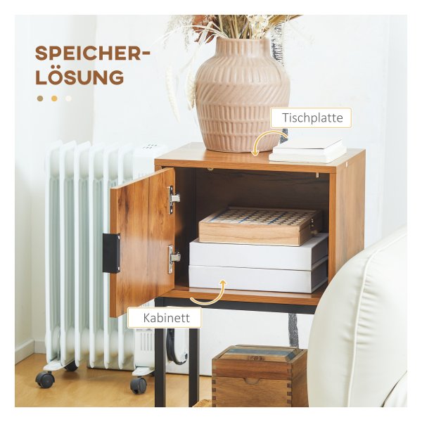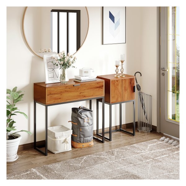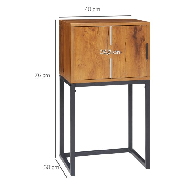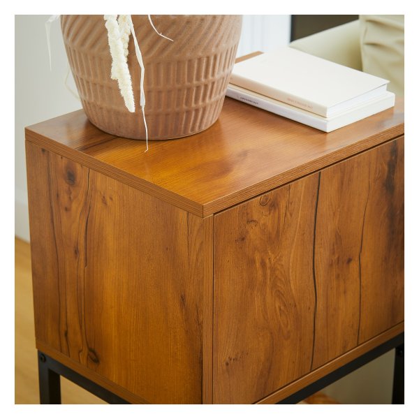 Met zijn natuurlijke houtlook en zwarte stalen frame straalt deze bijzettafel een industriƫle charme uit die een unieke touch aan je interieur geeft. De handgreep van aluminiumlegering zorgt ervoor dat je de kast gemakkelijk kunt openen en sluiten, terwijl de vloerbeschermers krassen op je vloer voorkomen.