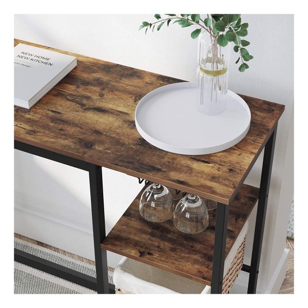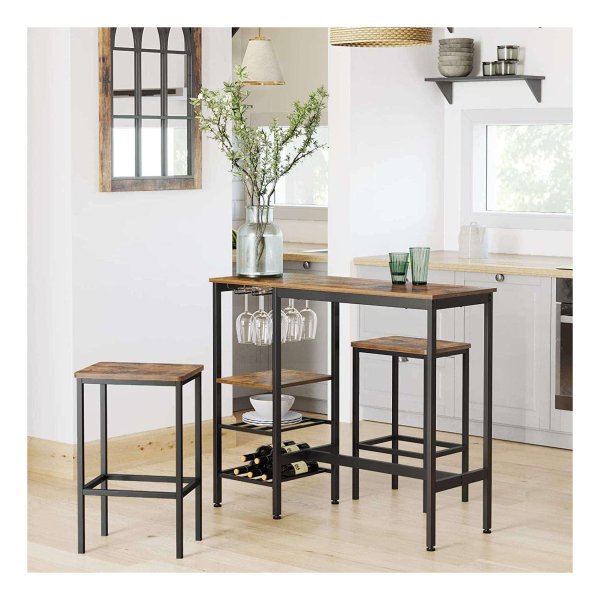 Wil je de waarheid horen? Je nieuwe eethoek met deze chique bartafel ziet er echt geweldig uit, heel eerlijk. Zwart stalen frame, vintage oppervlak, 2 planken voor wijnflessen en 2 houders voor glazen – esthetiek ontmoet functionaliteit