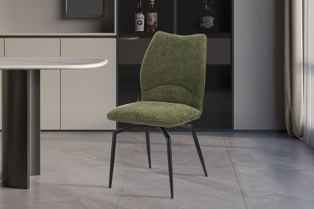 Stoel ‘Lara’ draaibaar tot 360 graden in groene stof, afmetingen 89 x 45. 5 x 60 cm. Een comfortabele en stijlvolle toevoeging aan elk interieur.