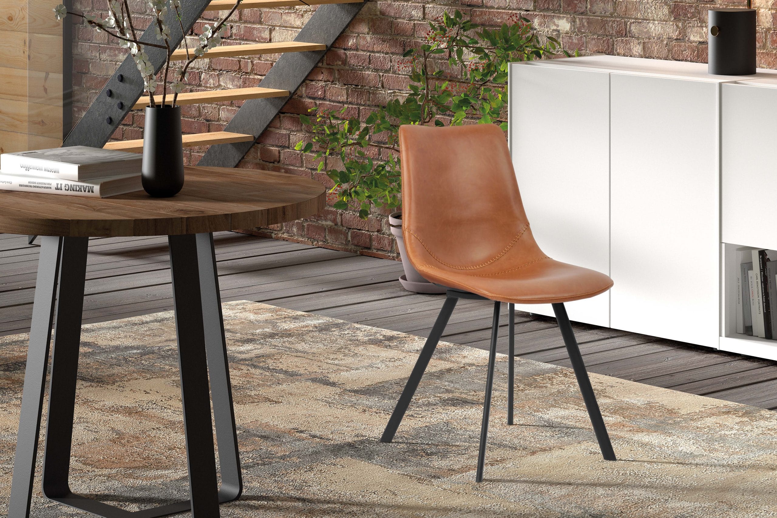 De stoel heeft een stevig metalen frame en is bekleed met hoogwaardig PU leer in de kleur Cognac. Het warme leer zorgt voor een gezellige sfeer in elke ruimte. De moderne uitstraling van deze stoel maakt het een opvallend meubelstuk in je interieur.