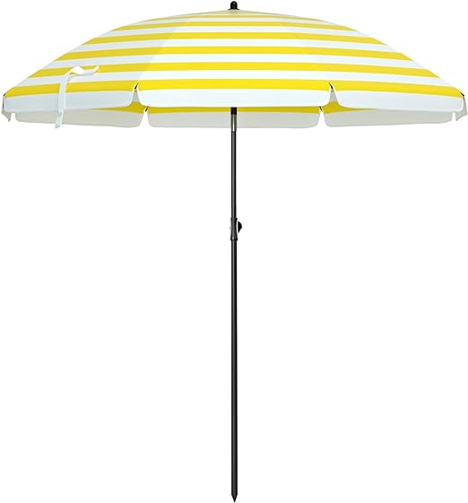Kleur: geel-wit gestreeptMateriaal: Paraplu van gepoedercoat staal, 160 g/m² polyesterweefsel met PA-coating, ribben van glasvezel. Lengte van de welving: 1,8 mHorizontale diameter: 1,6 mGewicht: 1,5 kg