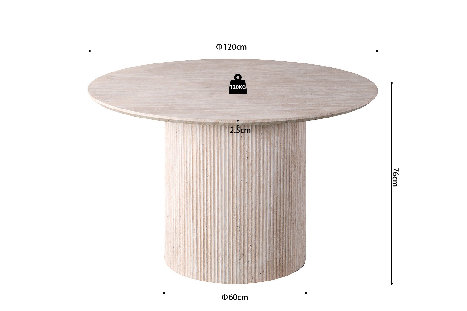 Een ronde tafeldecoratie van 120 cm met travertijnen beige decoratie, perfect voor een gezellige eettafel. Met afmetingen van 76 x 120 x 120 cm..