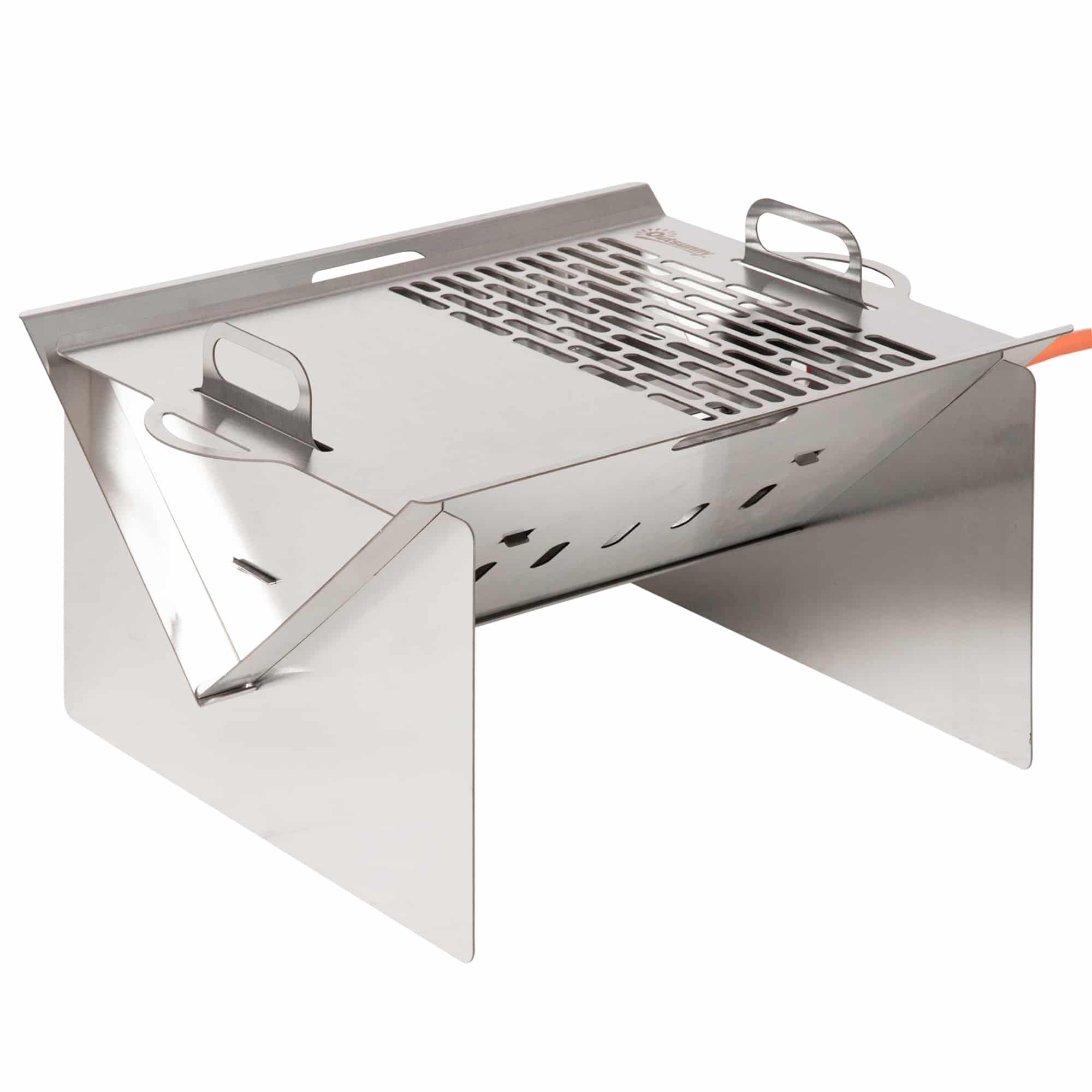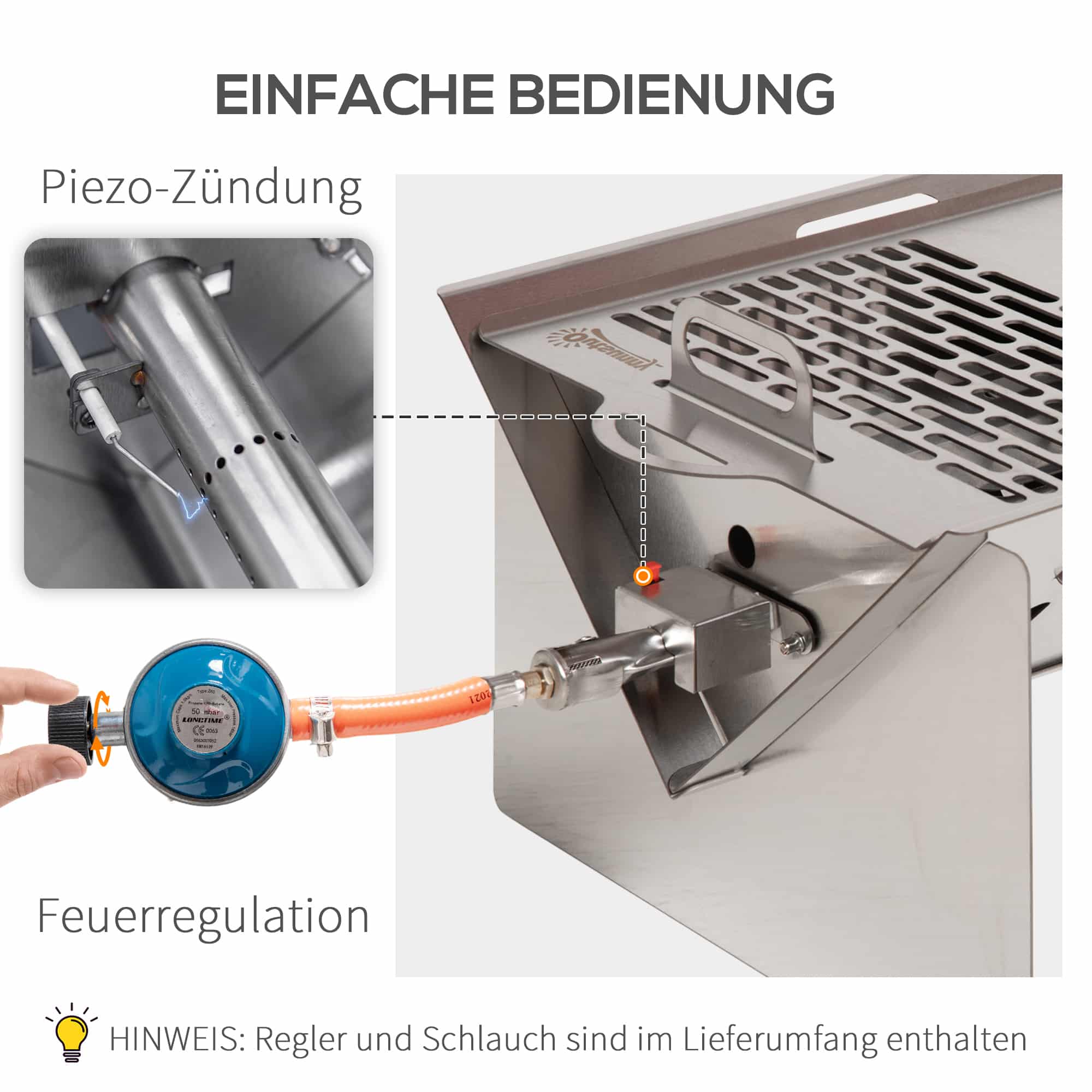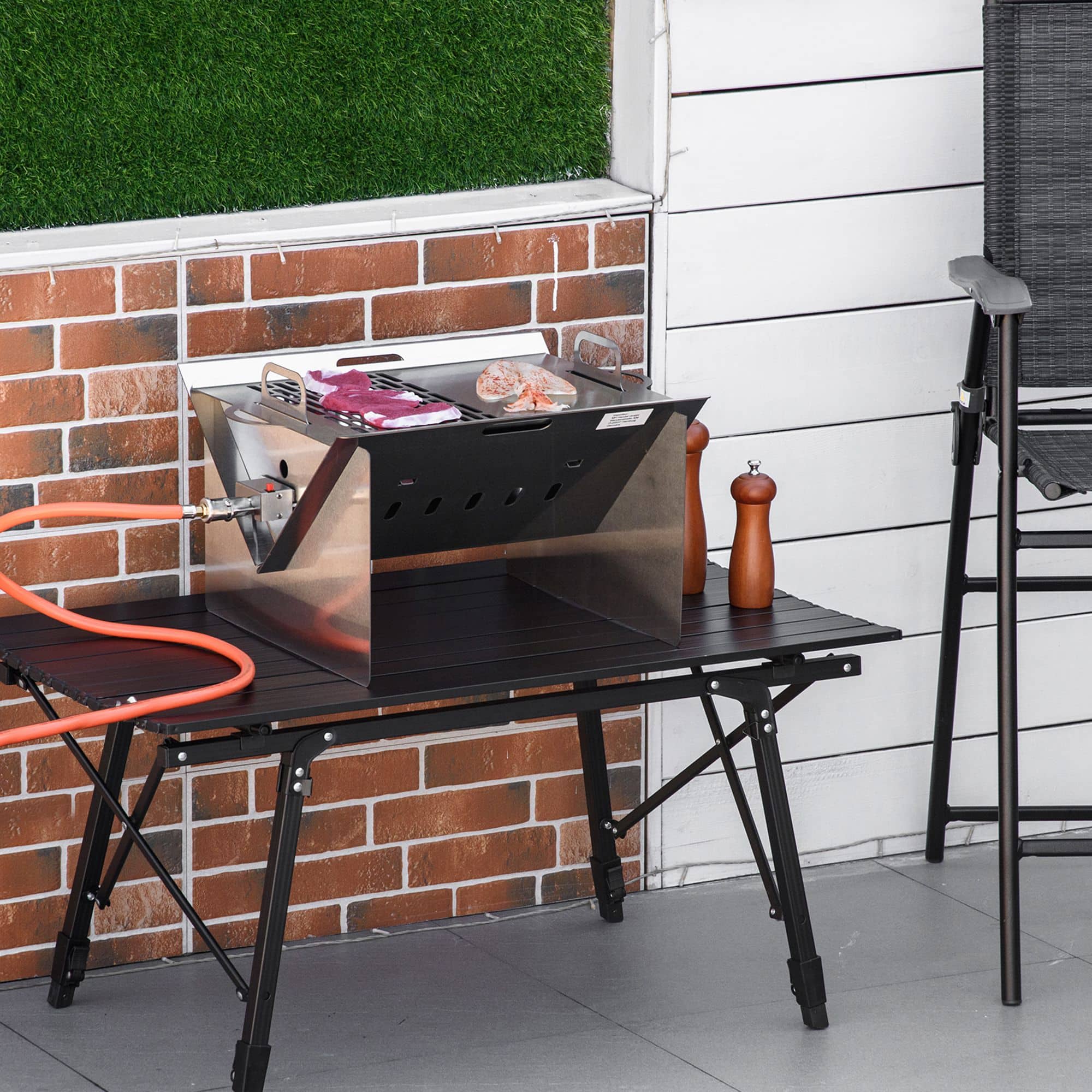 Deze compacte gasbarbecue is de perfecte aanvulling op jouw buitenruimte. Met een verwijderbare houtskool campinggrill, grillnet, slang en een klein buitentafel gasgrill picknick, biedt deze barbecue alles wat je nodig hebt voor een heerlijke barbecue-ervaring. Het hoogwaardige roestvrijstalen materiaal zorgt ervoor dat deze barbecue sterk en duurzaam is, waardoor je er jarenlang van kunt genieten.