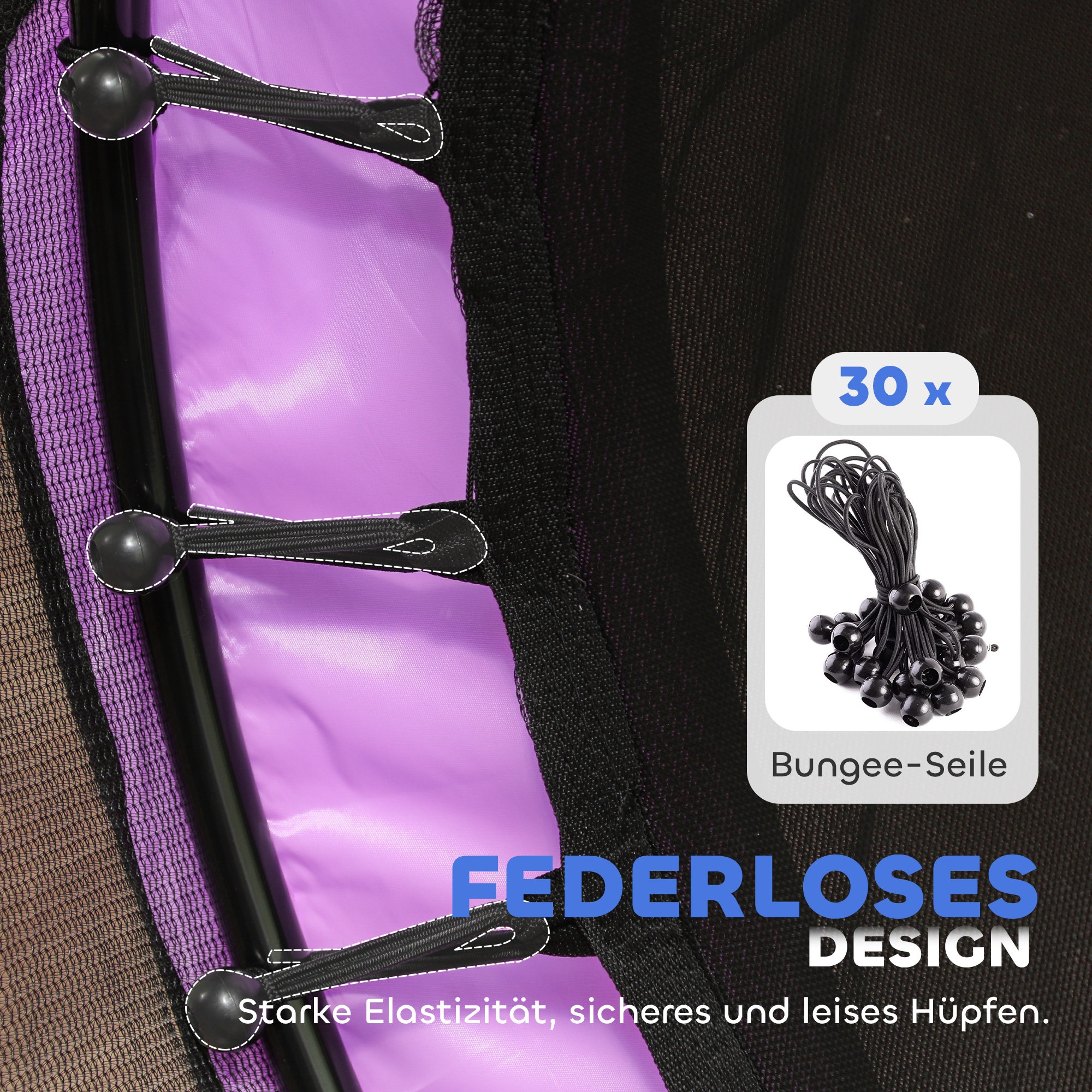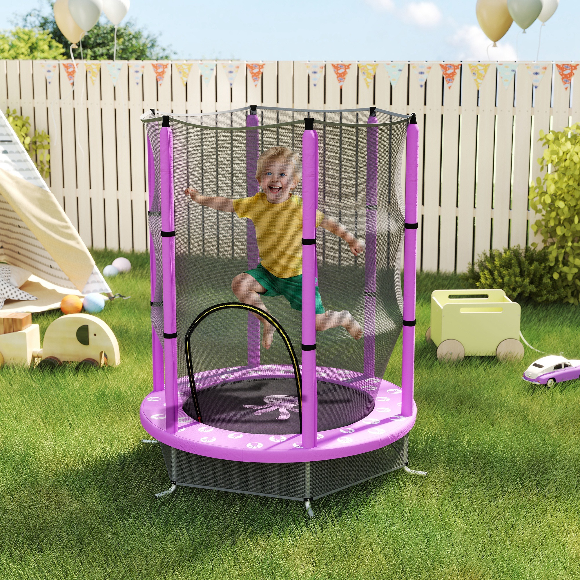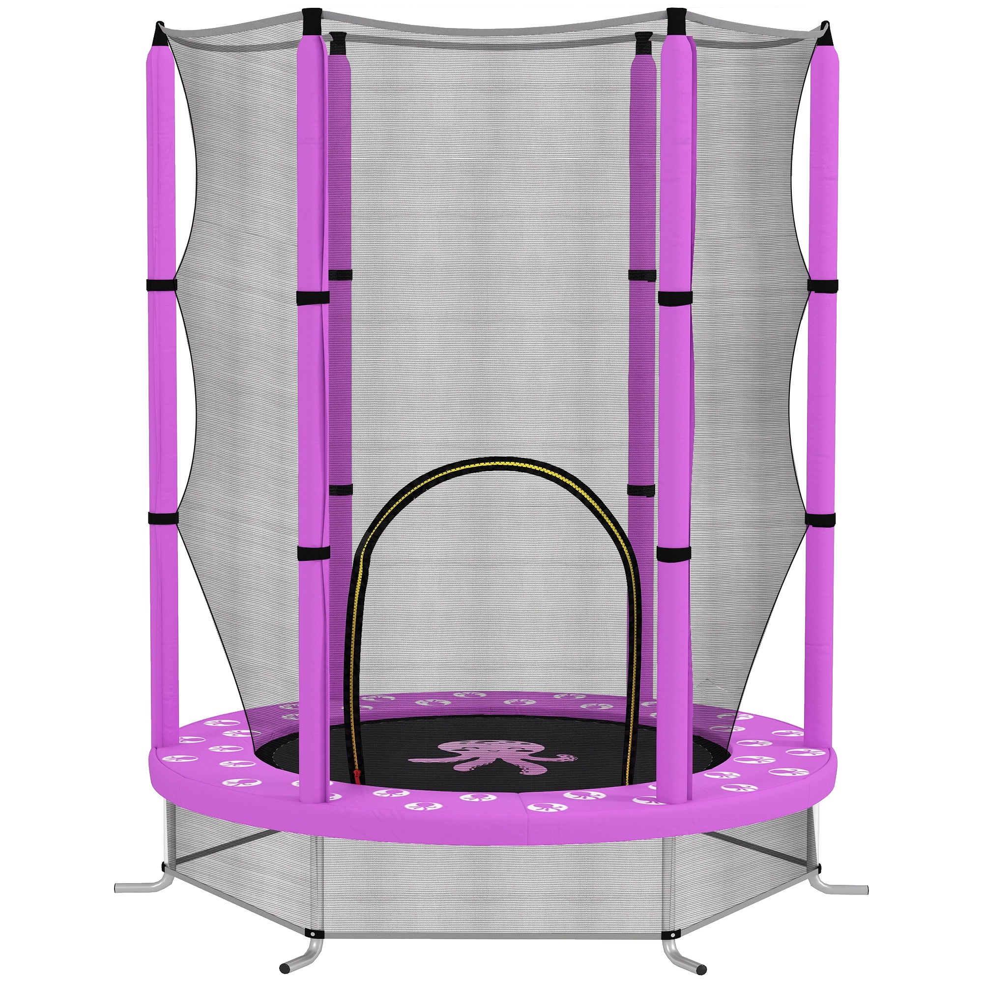 Deze paarse kindertrampoline biedt urenlang springplezier met een veiligheidsnet en duurzaam springdoek. Geschikt voor binnen en buiten, ideaal voor kinderen van 3-6 jaar. Ø140 x 190H cm, max.
