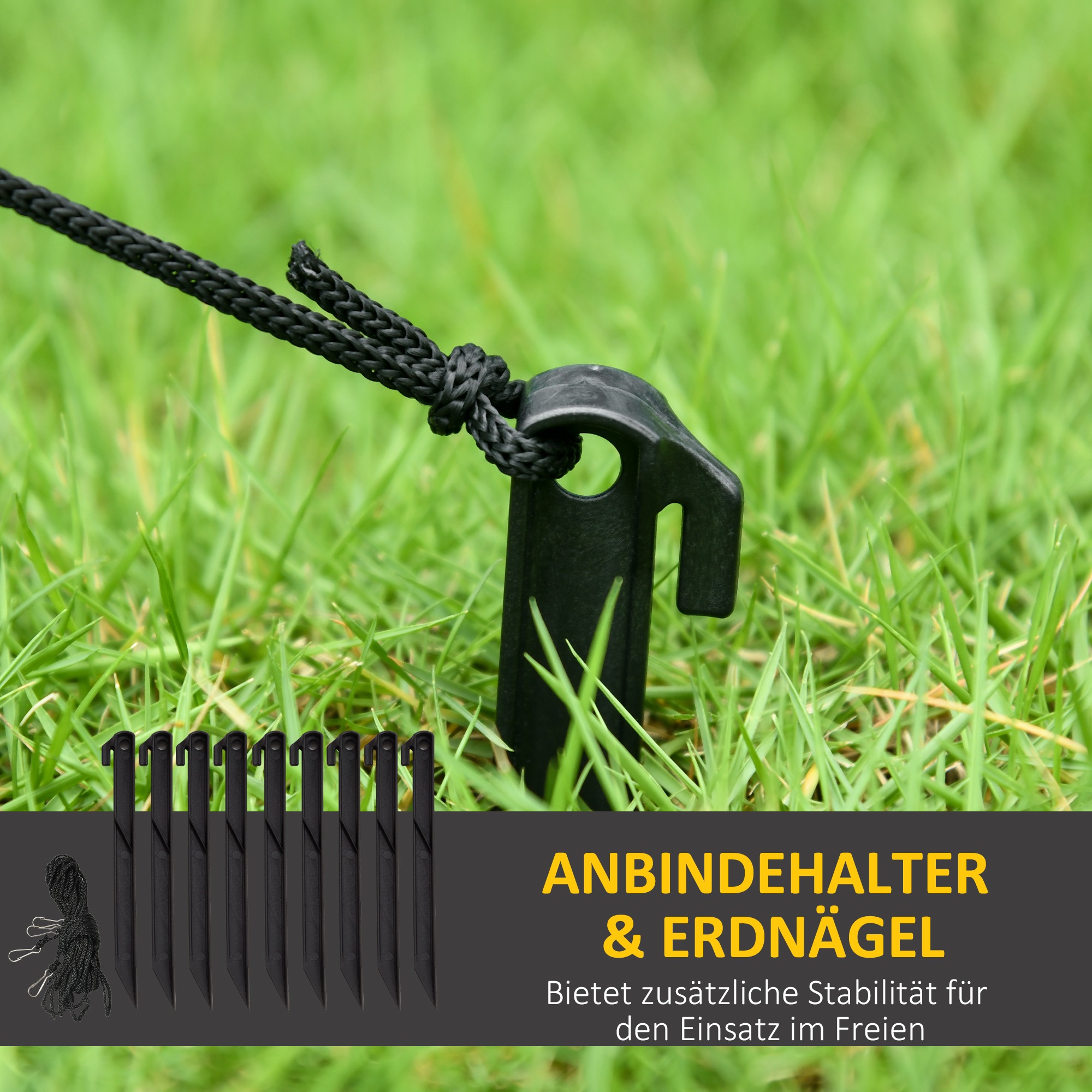 Om ervoor te zorgen dat de opblaasbare decoratie veilig blijft staan, wordt deze geleverd met acht grondpennen en vier spanlijnen. Hiermee kunt u de decoratie stevig verankeren, zelfs bij winderig weer.