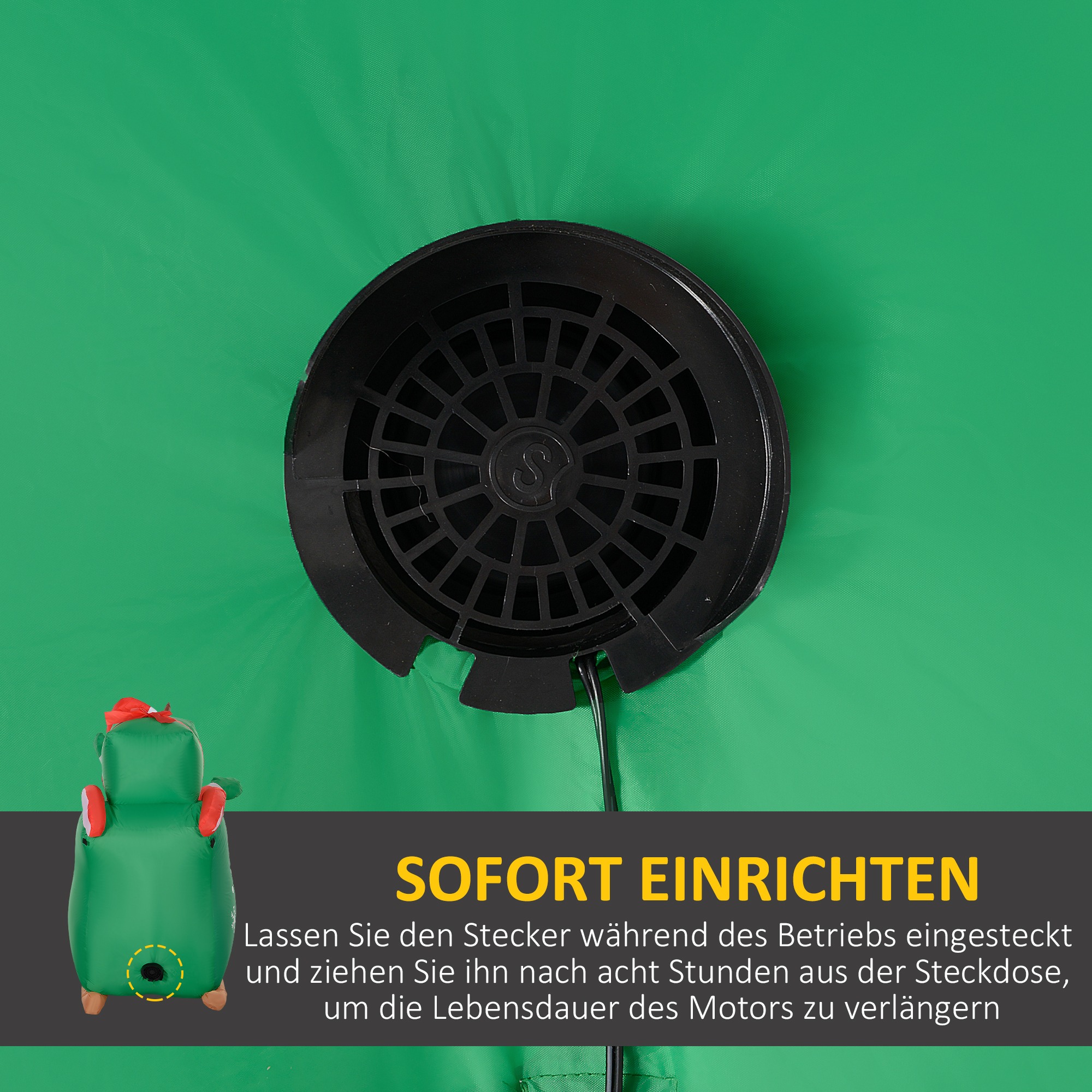 - ✔ Let op: De blower moet aangesloten blijven om de decoratie opgeblazen te houden. Niet langer dan 8 uur achtereen gebruiken en vermijden bij zwaar weer.