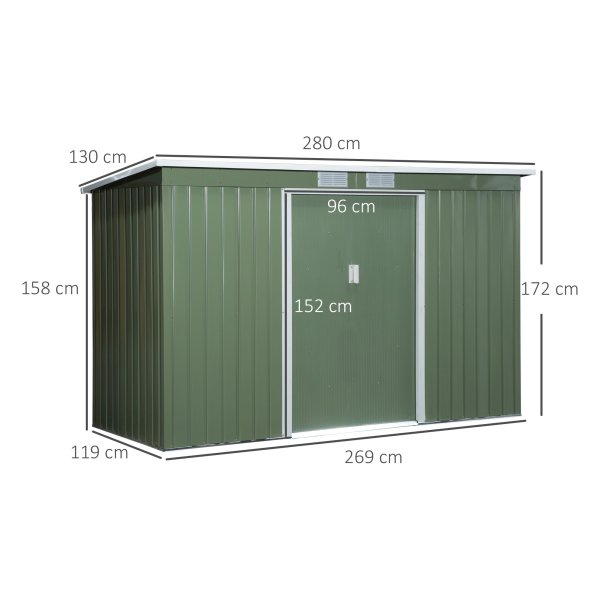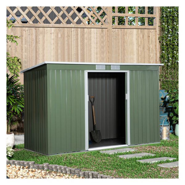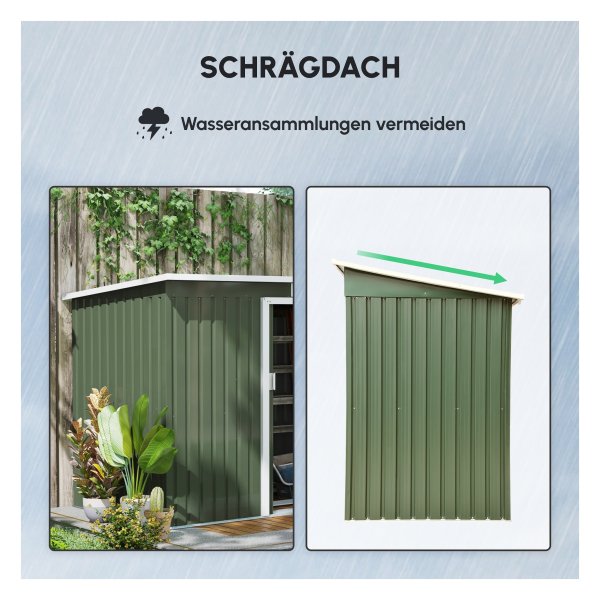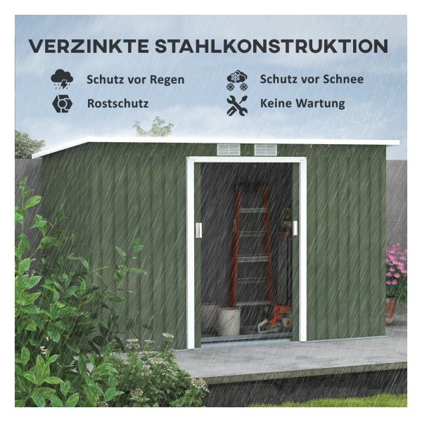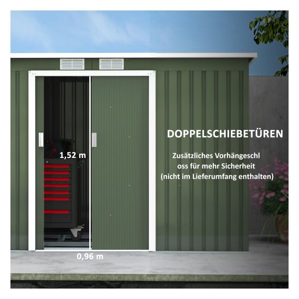 Duurzaam en ruim tuinhuis van verzinkt staal, met schuifdeuren, goede ventilatie en bescherming tegen weer. Eenvoudig te monteren en biedt veel opbergruimte voor tuingereedschap. Kleur: Hellgrün.