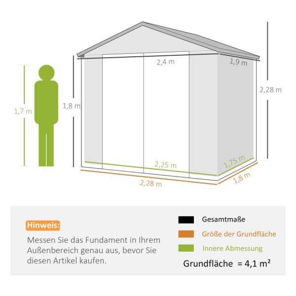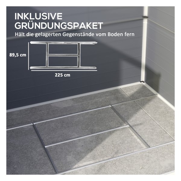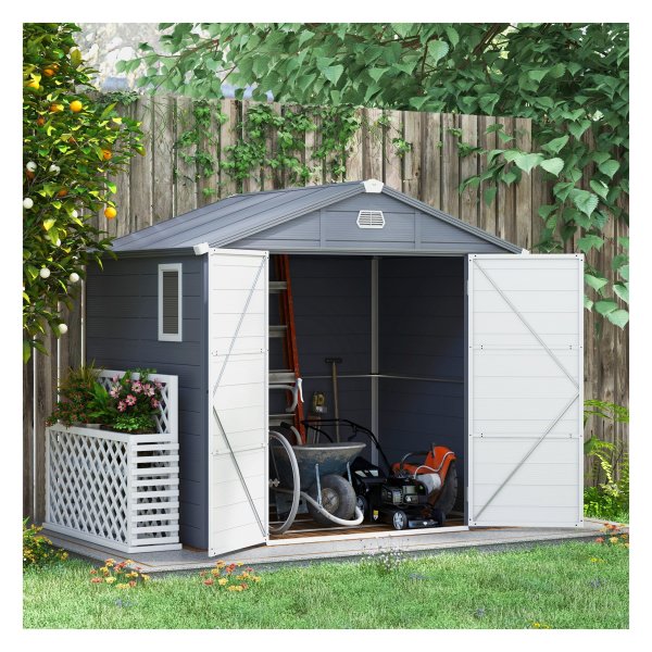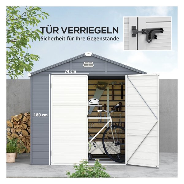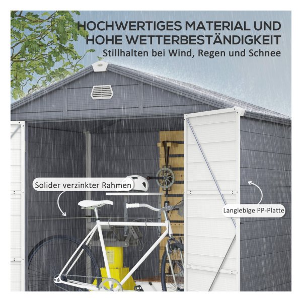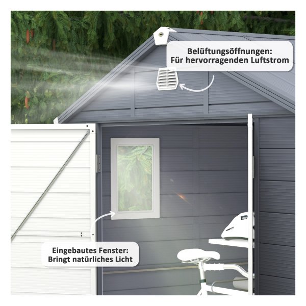 Das Outsunny Gartenhaus aus Kunststoff bietet sicheren und geräumigen Stauraum für Gartengeräte. Mit belüfteten Seitenfenstern und einer abschließbaren Tür schützt das tuinkastje Ihre Geräte vor Feuchtigkeit und Schimmel. Maße: 240L x 190B x 228H cm, Far.