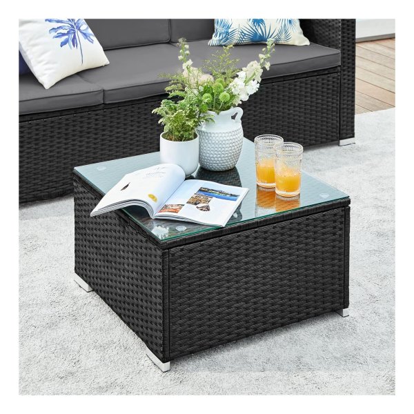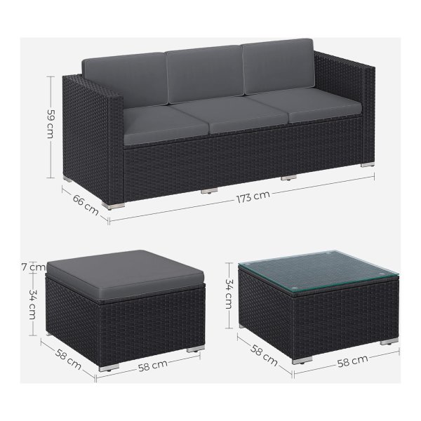 Materiaal bank en tafel: PE polyrotan (polyethyleen), gepoedercoat staal, gehard glas