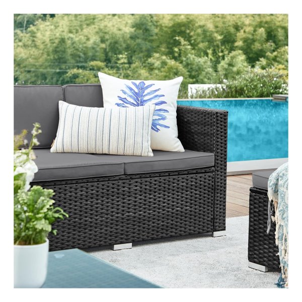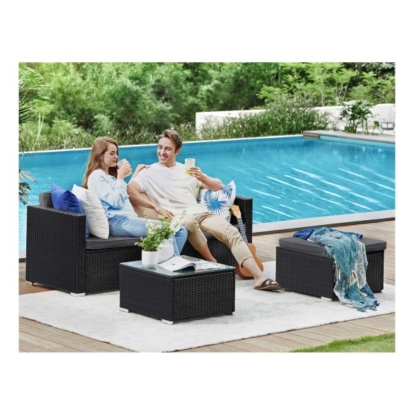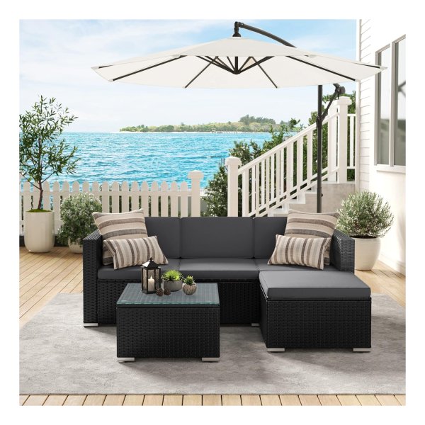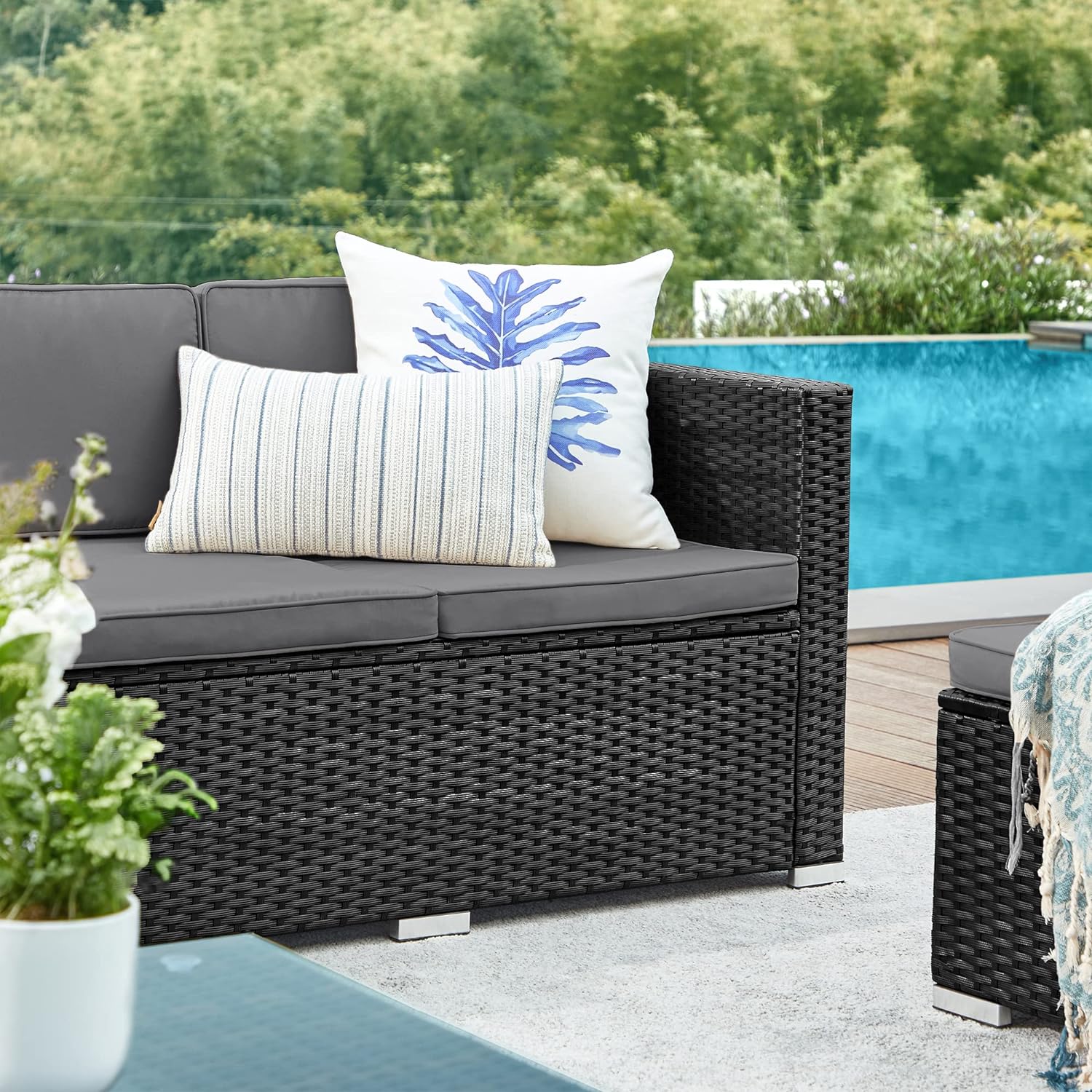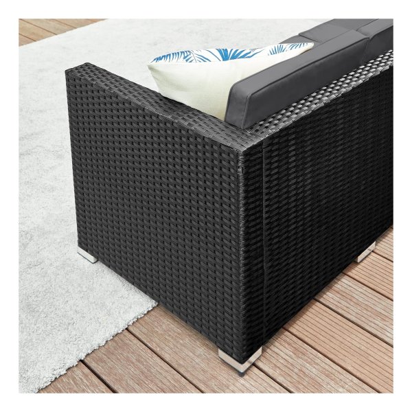 Tuinmeubelset, balkonmeubilair, terrasmeubilair van polyrotan, hoekbank, buiten, handgeweven rotan, loungeset, met kussen en glazen tafel, zwart en grijs