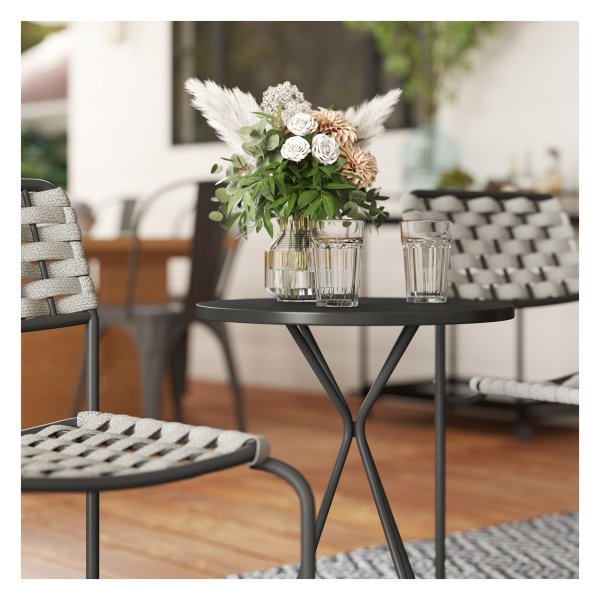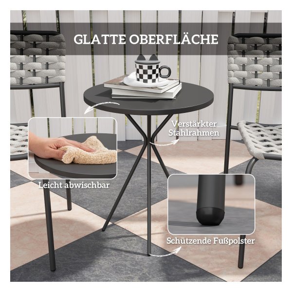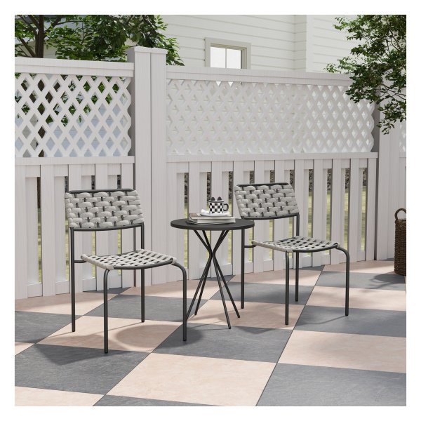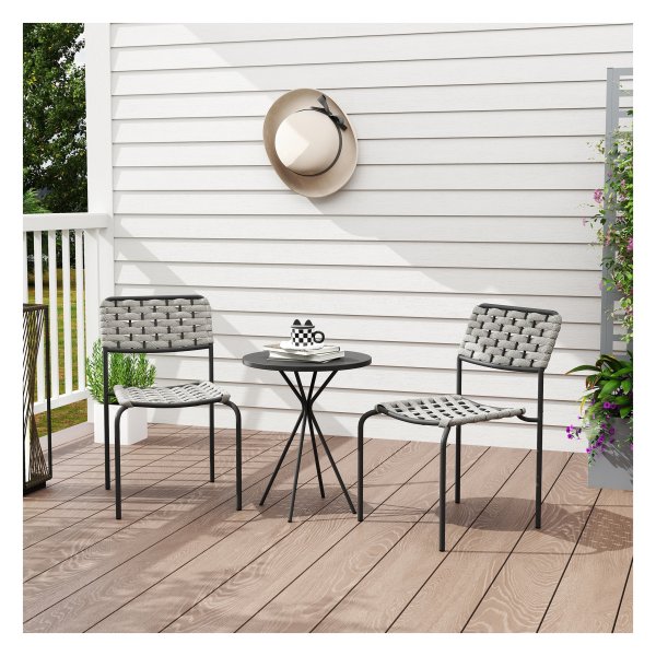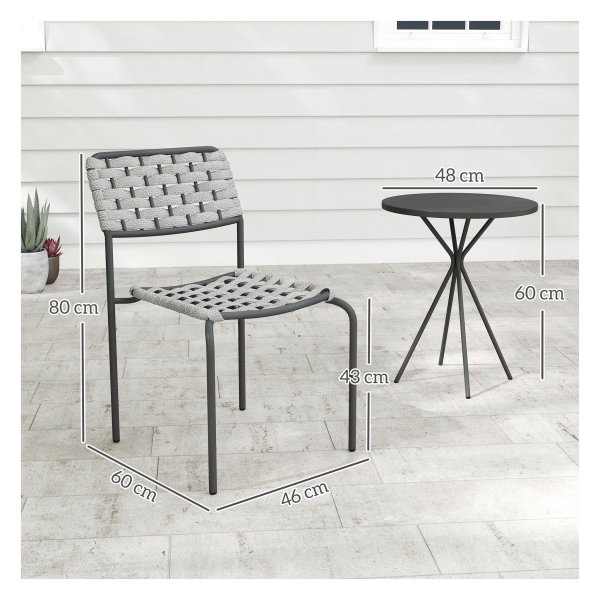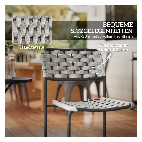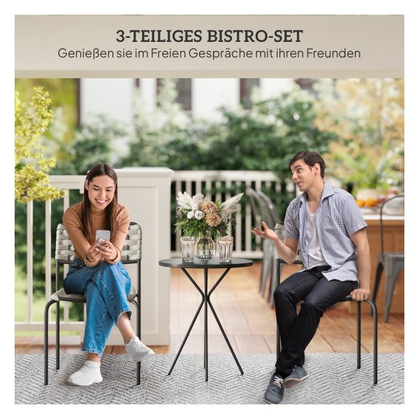 De Tuinmeubelset is gemaakt van hoogwaardige materialen die bestand zijn tegen verschillende weersomstandigheden. De stalen frames van de stoelen en tafel zorgen voor stabiliteit en duurzaamheid, terwijl de grijze afwerking een moderne uitstraling geeft aan je buitenruimte.