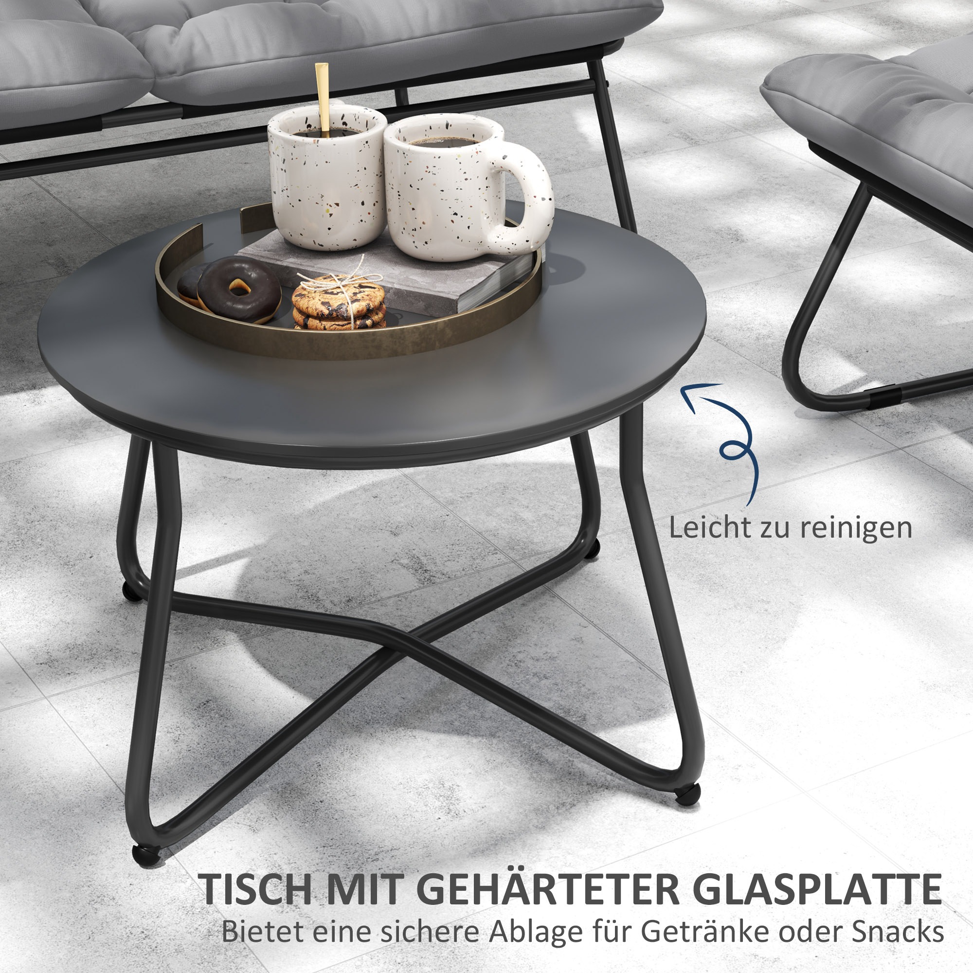 The garden furniture set transforms your garden into a stylish lounge experience. Consisting of a two-seater sofa, two chairs, and a round coffee table with a tempered glass surface. Designed for comfort and durability, ideal for any outdoor setting.