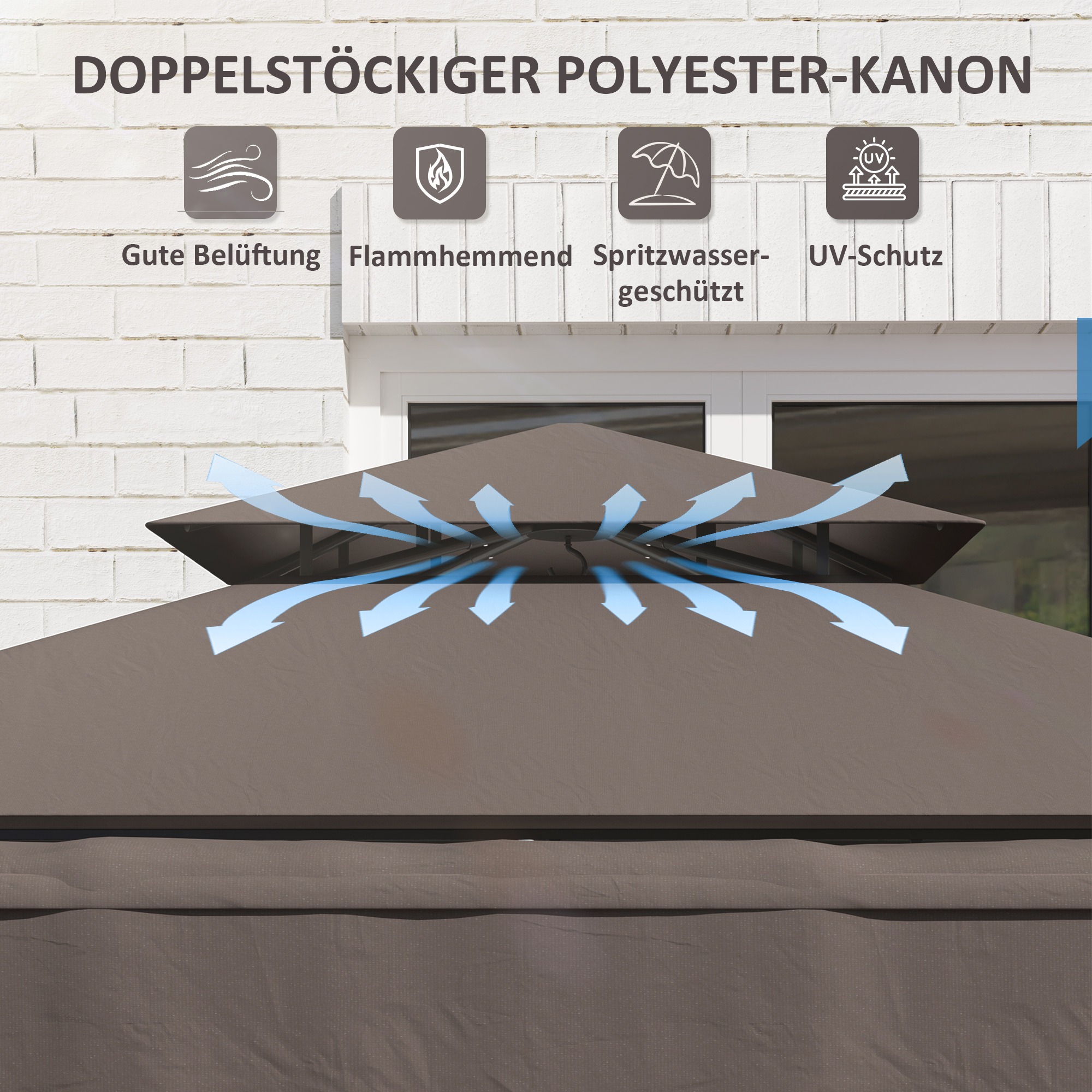 - Vlamvertragend: De vlamvertragende eigenschappen van het paviljoen zorgen voor extra veiligheid tijdens het gebruik, vooral bij het koken of barbecueën.