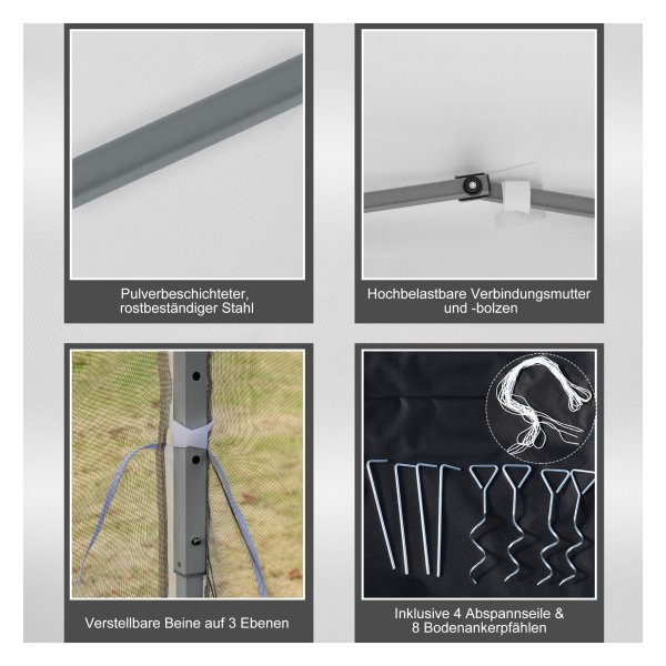- ✔ Extra stabiliteit dankzij meegeleverde haringen, grondpennen en touwen voor verankering