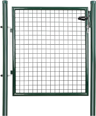 Materiaal: verzinkt stalen buis + verzinkt draadgaas + kunststof handgrepen + ijzeren sleutelkleur: Gepoedercoat in RAL 6005 – groenafmetingen: 106 x 150 x 6 cm (B x H x D)Buitenafmetingen deur: 100 x 87 cm. Paalhoogte: 150 cm. Diameter palen: 60 mmDiameter deurkozijn: 40 mm. Draaddikte: 4 mm. Maasbreedte: 50 x 50 mm. Gewicht: 15 kg