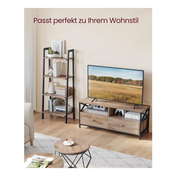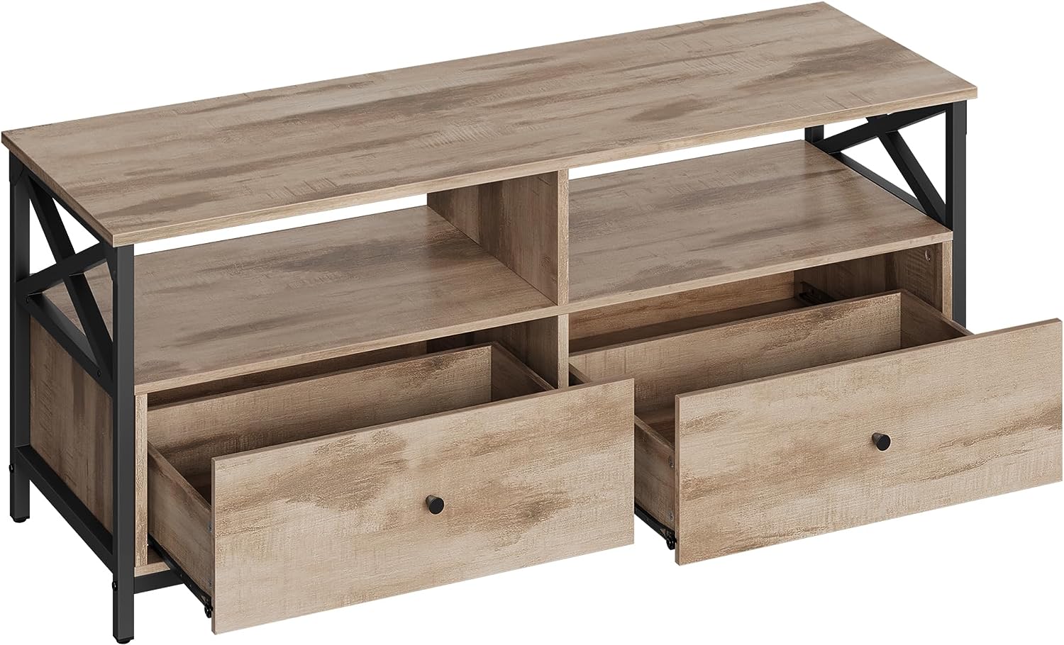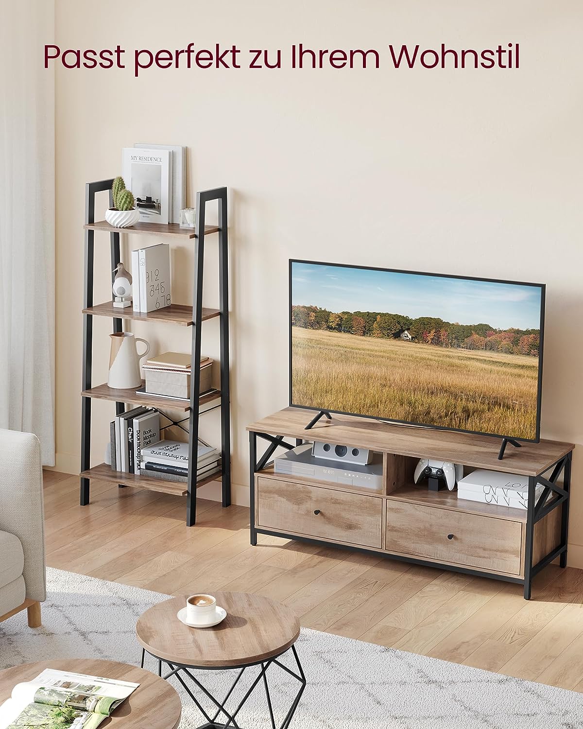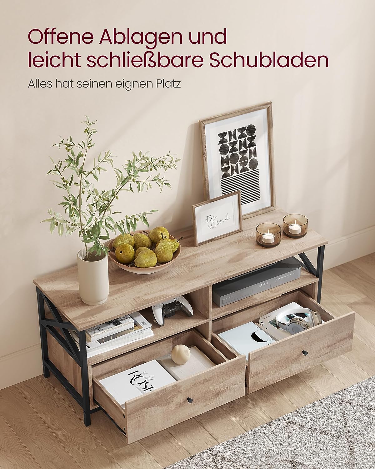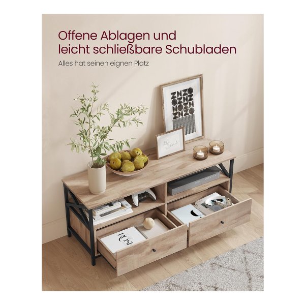 TV-kast, Lowboard voor tv’s tot 55 inch, 120 cm lang, televisietafel met 2 laden, 2 open vakken, 40 x 120 x 50 cm, woonkamer, stalen frame, eikenbruin-zwart