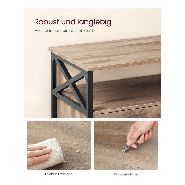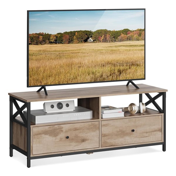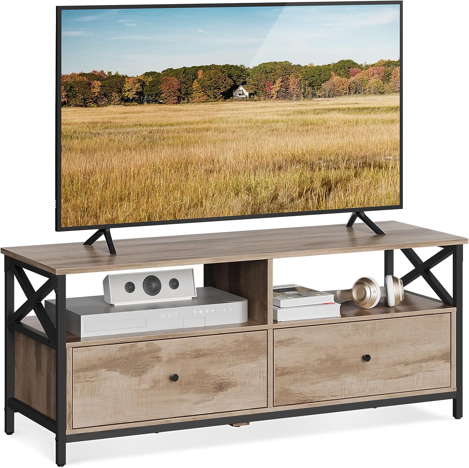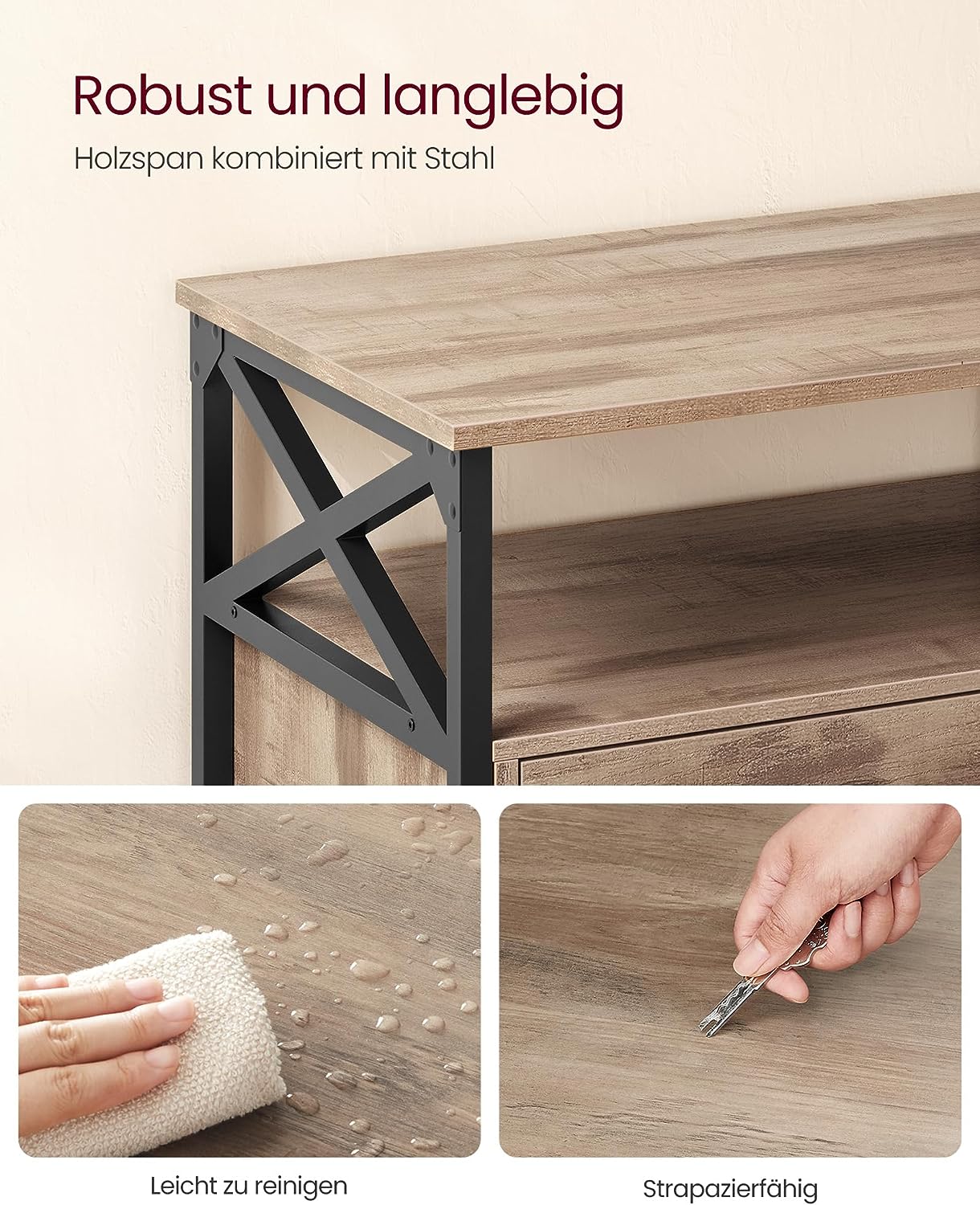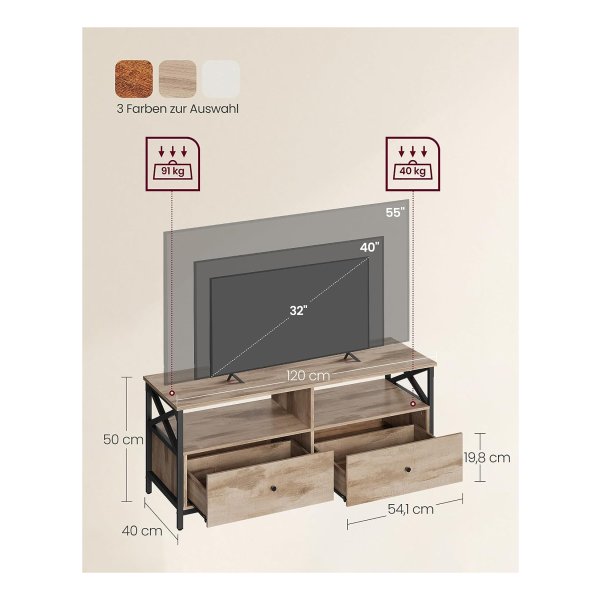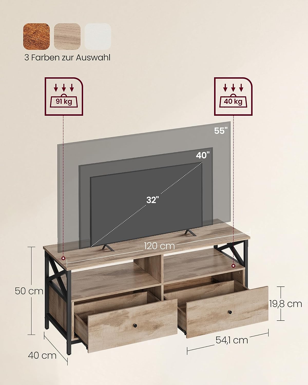 TV-kast, Lowboard voor tv’s tot 55 inch, 120 cm lang, televisietafel met 2 laden, 2 open vakken, 40 x 120 x 50 cm, woonkamer, stalen frame, eikenbruin-zwart