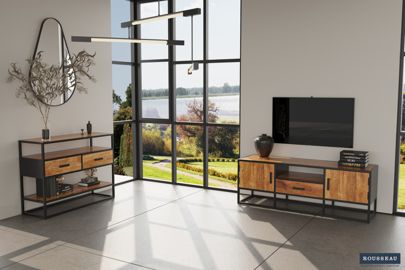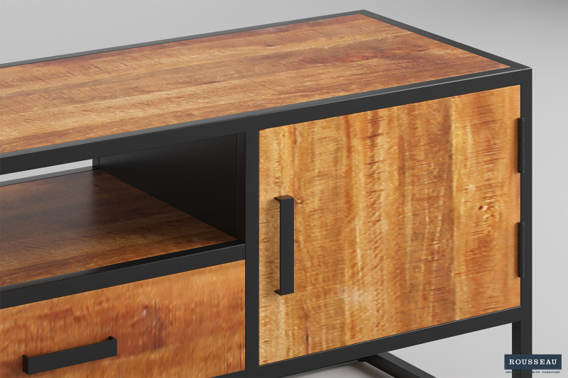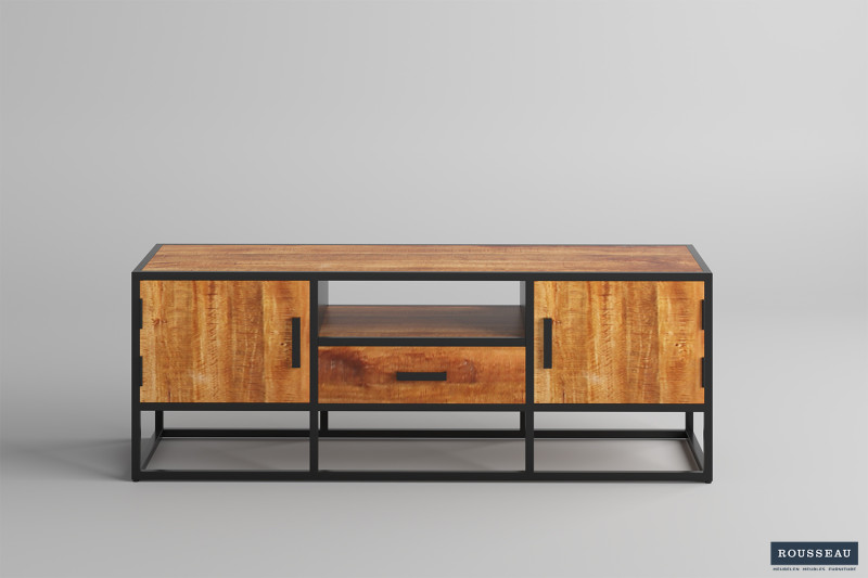 Tv-meubel ‘Madeira’ 140 cm Mangolia, Structuur metaal en blad exotisch hout mangolia
